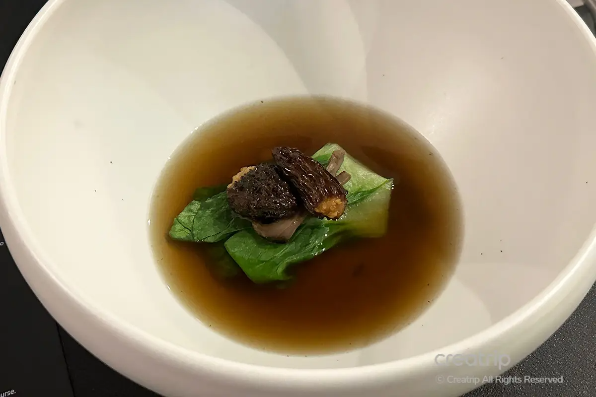 ต่อไปในส่วนของอาหารเรียกน้ำย่อย จานแรกประกอบด้วยเห็ดมอเรล เห็ดหูหนู เต้าหู้ หมู ข้าวบาร์เลย์ และผักกวางตุ้ง เห็ดที่สอดไส้เนื้อ กลิ่นหอมสะอาดของน้ำซุปเห็ดเอโนกิ และเนื้อสัมผัสของข้าวบาร์เลย์สร้างรสชาติที่เข้ากันอย่างลงตัว