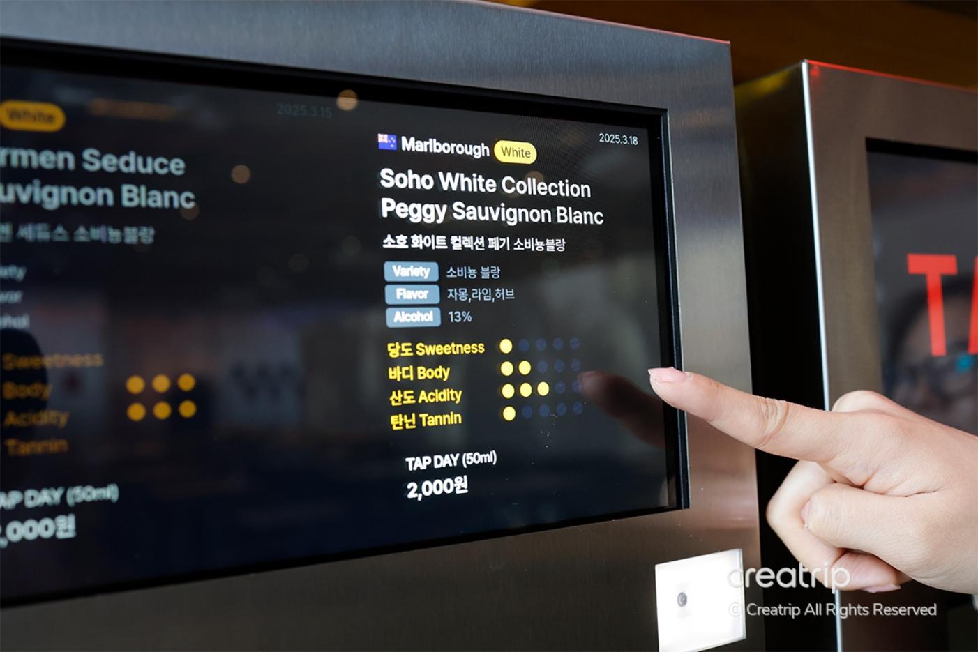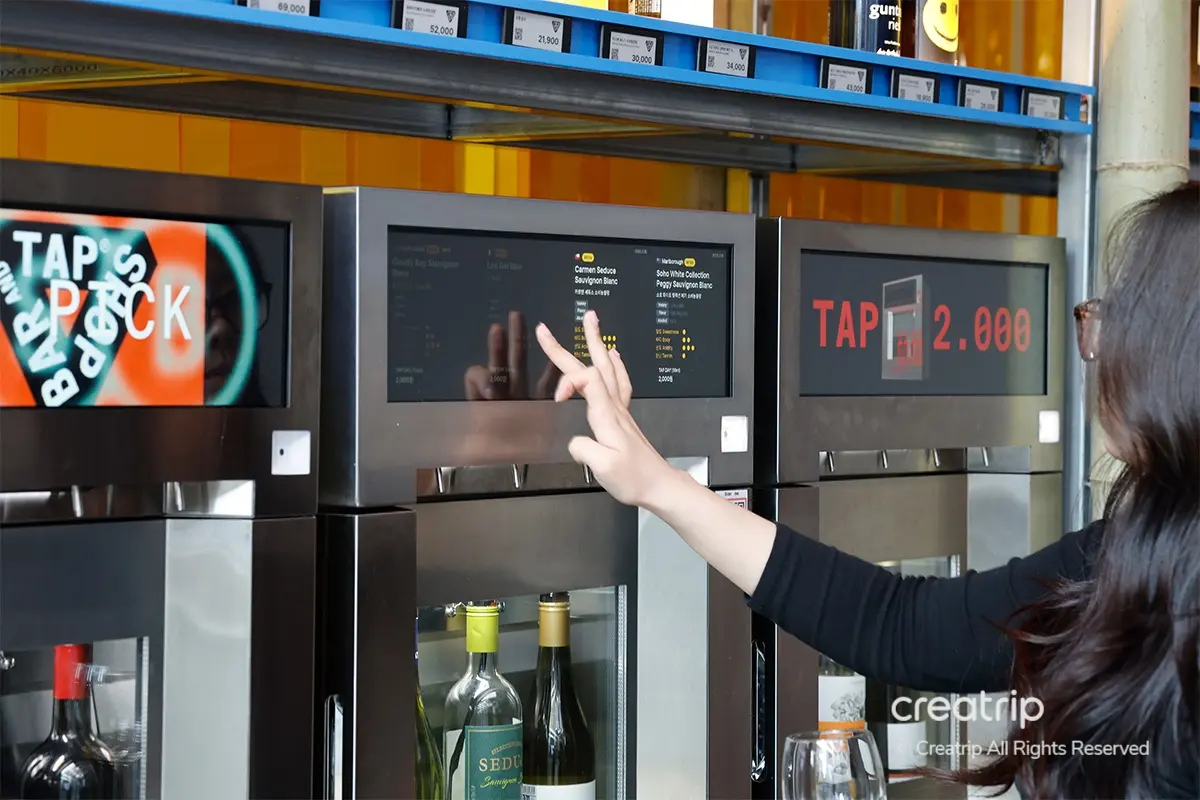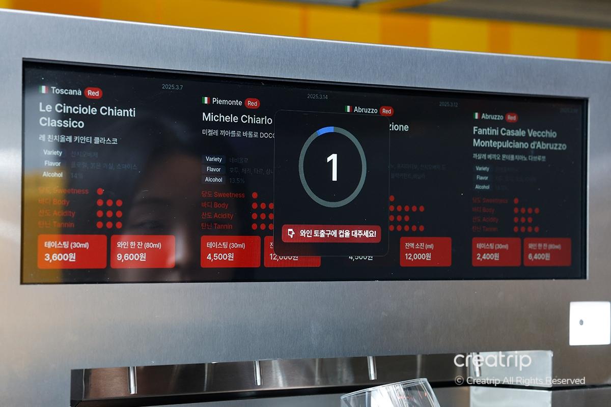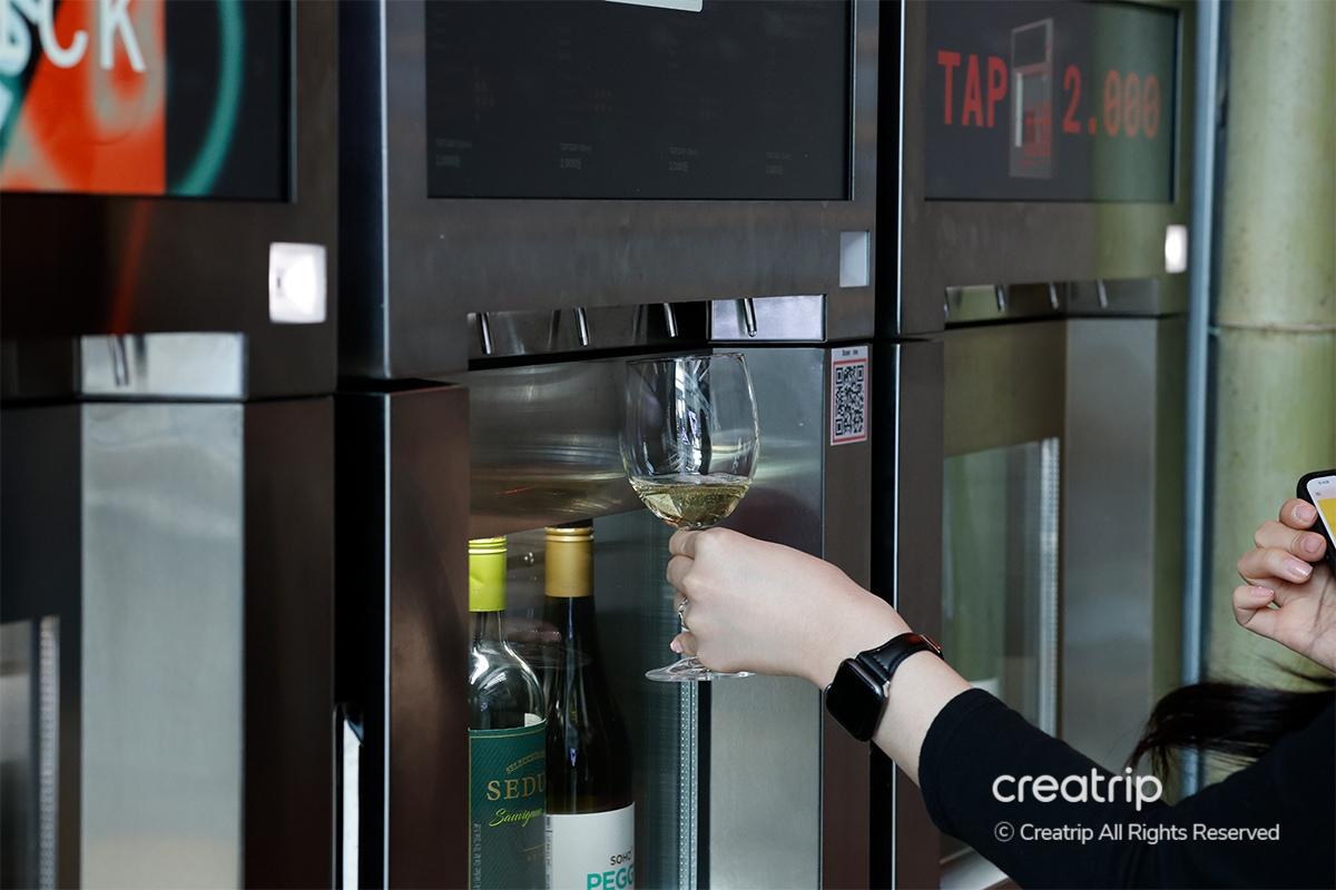 ตู้จ่ายไวน์ไม่มีเพียงแค่ไวน์ขาว, ไวน์แดง, และไวน์โรเซ่, แต่ยังมีสาเกและวิสกี้ด้วย! เมื่อคุณแตะที่หน้าจอ, คุณยังสามารถเห็นคำอธิบายเกี่ยวกับไวน์อีกด้วย ซึ่งทำให้การเลือกไวน์ง่ายขึ้นมาก