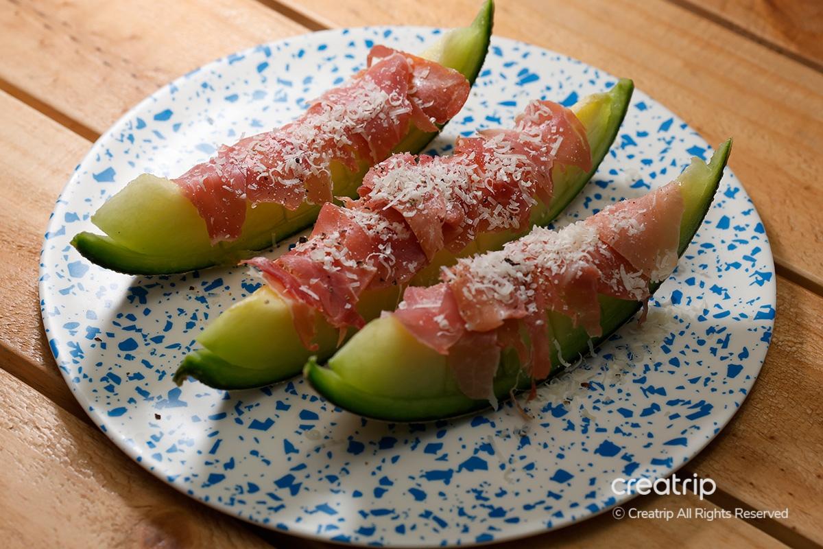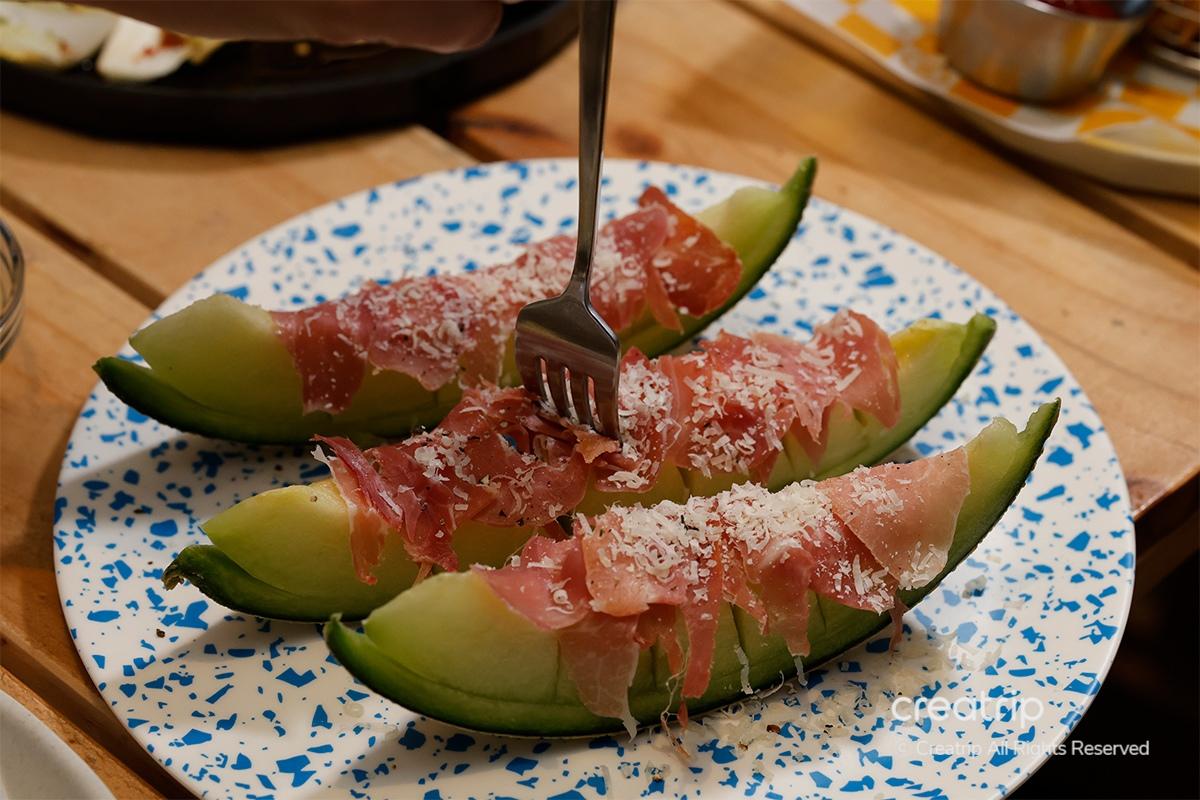 สุดท้ายแล้วมันคือ 'Jamon Melon' ก่อนอื่นเลย วิชวลสวยมาก และแตงโมมีขนาดใหญ่มาก การกินแตงโมหวานที่ราดด้วยแฮมเค็มเป็นการผสมผสานกันอย่างลงตัวของรสชาติหวานและเค็ม เป็นของว่างที่ยอดเยี่ยมสำหรับทานกับไวน์!