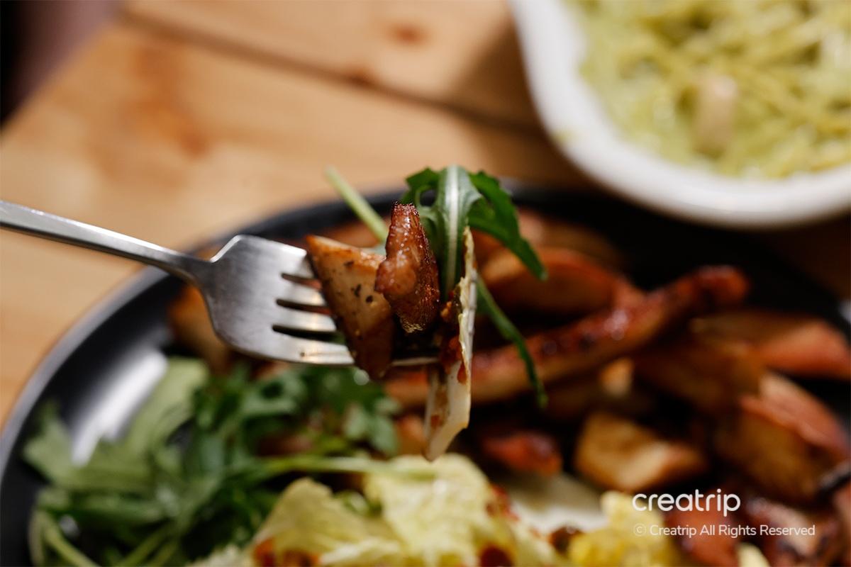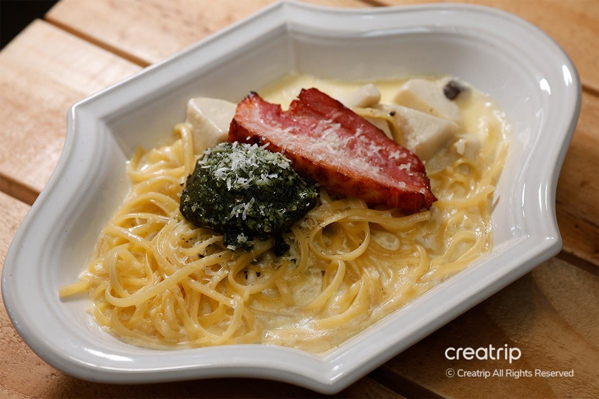 'Basil Cream Pasta' คือพาสต้าที่มีซอสครีมเนียนผสมกับกลิ่นสดชื่นของใบโหระพา การผสมผสานระหว่างใบโหระพาและครีมนี้สมบูรณ์แบบจนทำให้ฉันประหลาดใจที่ความอร่อยเมื่อได้ลองทานครั้งแรก นอกจากนี้ยังมีเบคอนและเห็ดทั้งตัวเพิ่มเป็นท็อปปิ้งทำให้รสชาติหลากหลายยิ่งขึ้น