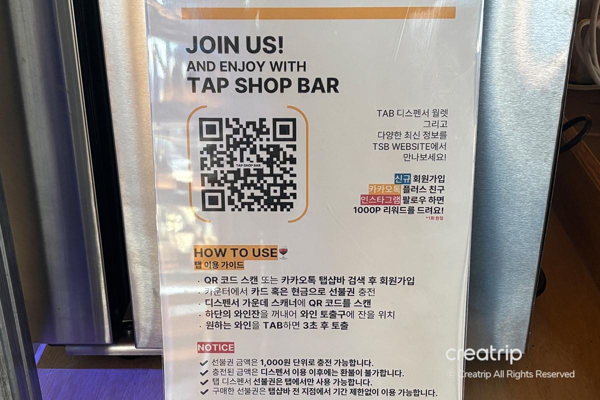 หากคุณไปที่เคาน์เตอร์ TAP และ SHOP และ BAR จะมีรหัส QR คุณสามารถลงทะเบียนง่าย ๆ ผ่านรหัส QR โปรดทราบว่ามีรหัส QR สำหรับภาษาต่างประเทศสำหรับชาวต่างชาติด้วย! ในลิงก์นี้ คุณสามารถตรวจสอบประวัติของคุณ เช่น กี่ครั้งที่คุณดื่มไวน์ที่ 'Tab Shop Bar' และคุณดื่มไวน์อะไร! หากคุณจำชื่อไวน์ที่เพิ่งดื่มไม่ได้ คุณสามารถตรวจสอบชื่อโดยคลิกที่ลิงก์นี้