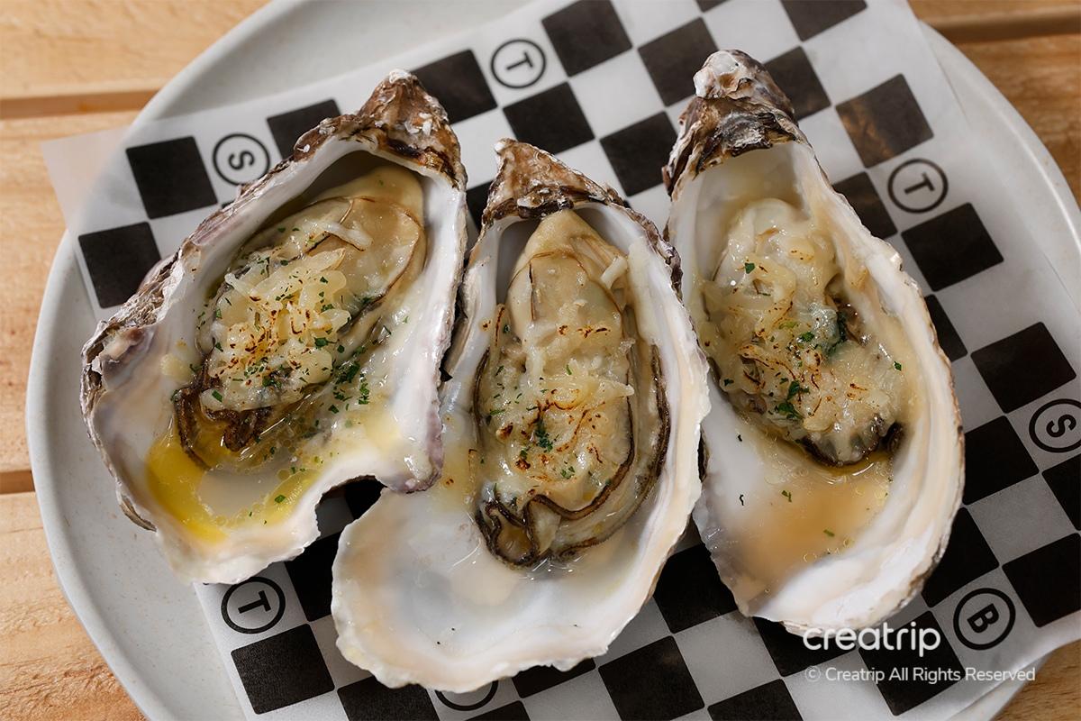 'Grilled oysters' มีเนื้อขนาดใหญ่มากซึ่งทำให้เคี้ยวได้เพลิดเพลินอย่างมาก มันมีรสชาติเนยและเข้ากันได้ดีกับชีส เนื้อสัมผัสนุ่มชื้นละลายในปากของฉันได้อย่างละมุนละไม รับรสชาติสดชื่นจากทะเลได้อย่างเต็มที่ และการจับคู่กับไวน์ก็ยอดเยี่ยมมาก