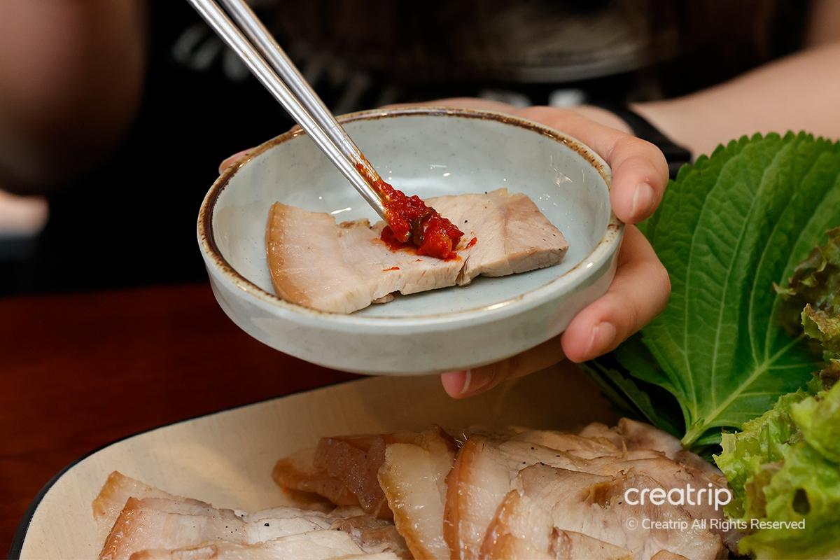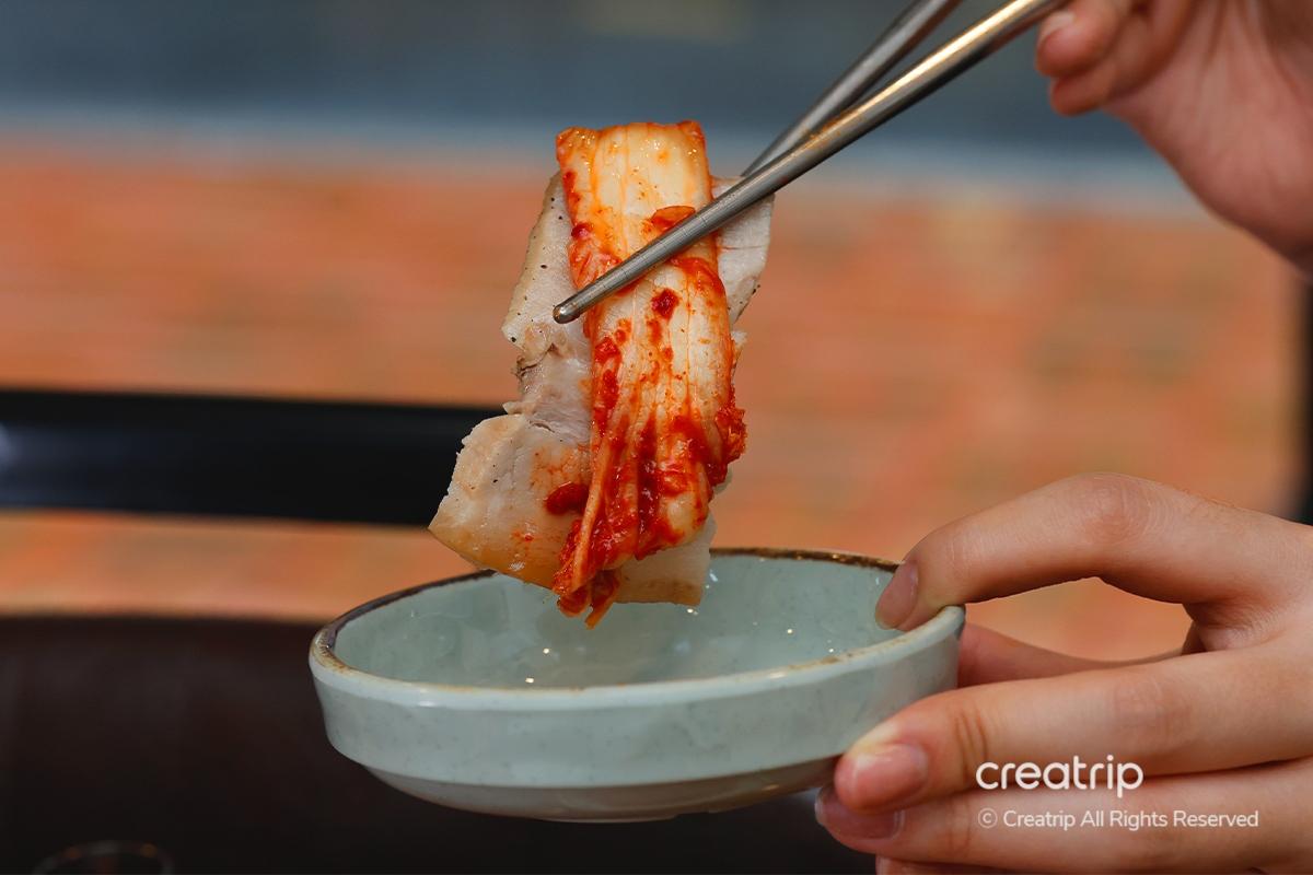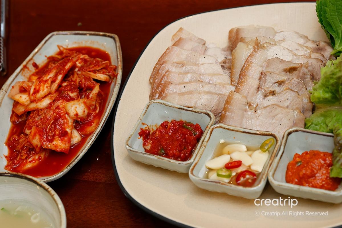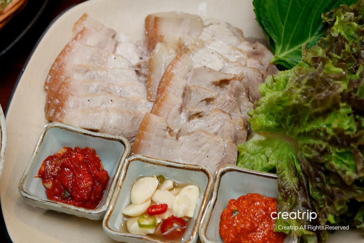 - หมูต้มที่มีหนังเด้ง เนื้อนุ่ม และมันหอมมัน สร้างความลงตัวอย่างสมบูรณ์แบบ เมื่อรับประทานคู่กับกิมจิ เป็นรสชาติที่เข้ากันดีจนคุณอาจจะอยากดื่มมักกอลลีเลยทีเดียว
