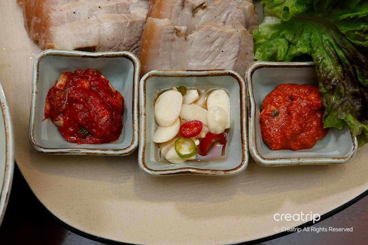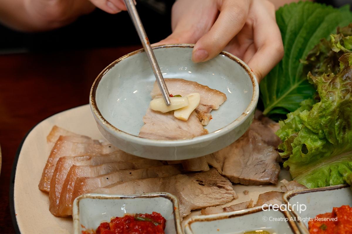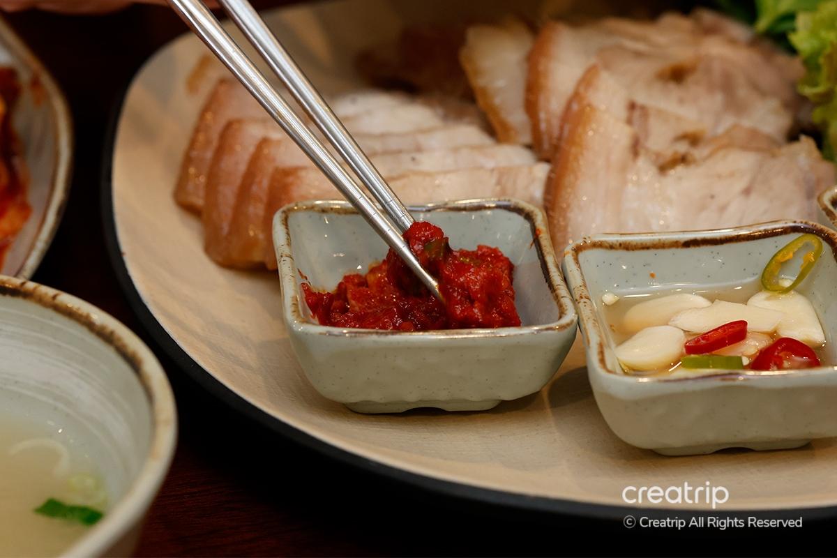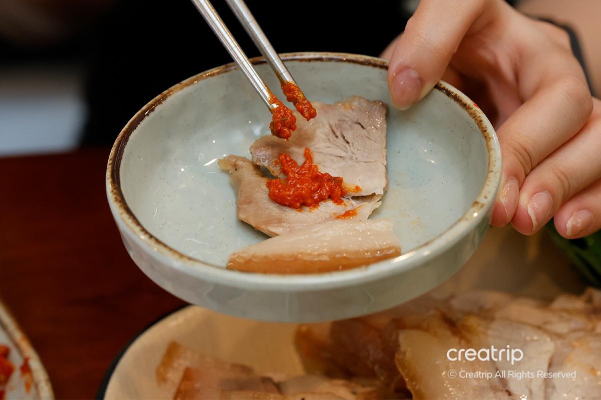 - หมูต้มที่มีหนังเด้ง เนื้อนุ่ม และมันหอมมัน สร้างความลงตัวอย่างสมบูรณ์แบบ เมื่อรับประทานคู่กับกิมจิ เป็นรสชาติที่เข้ากันดีจนคุณอาจจะอยากดื่มมักกอลลีเลยทีเดียว