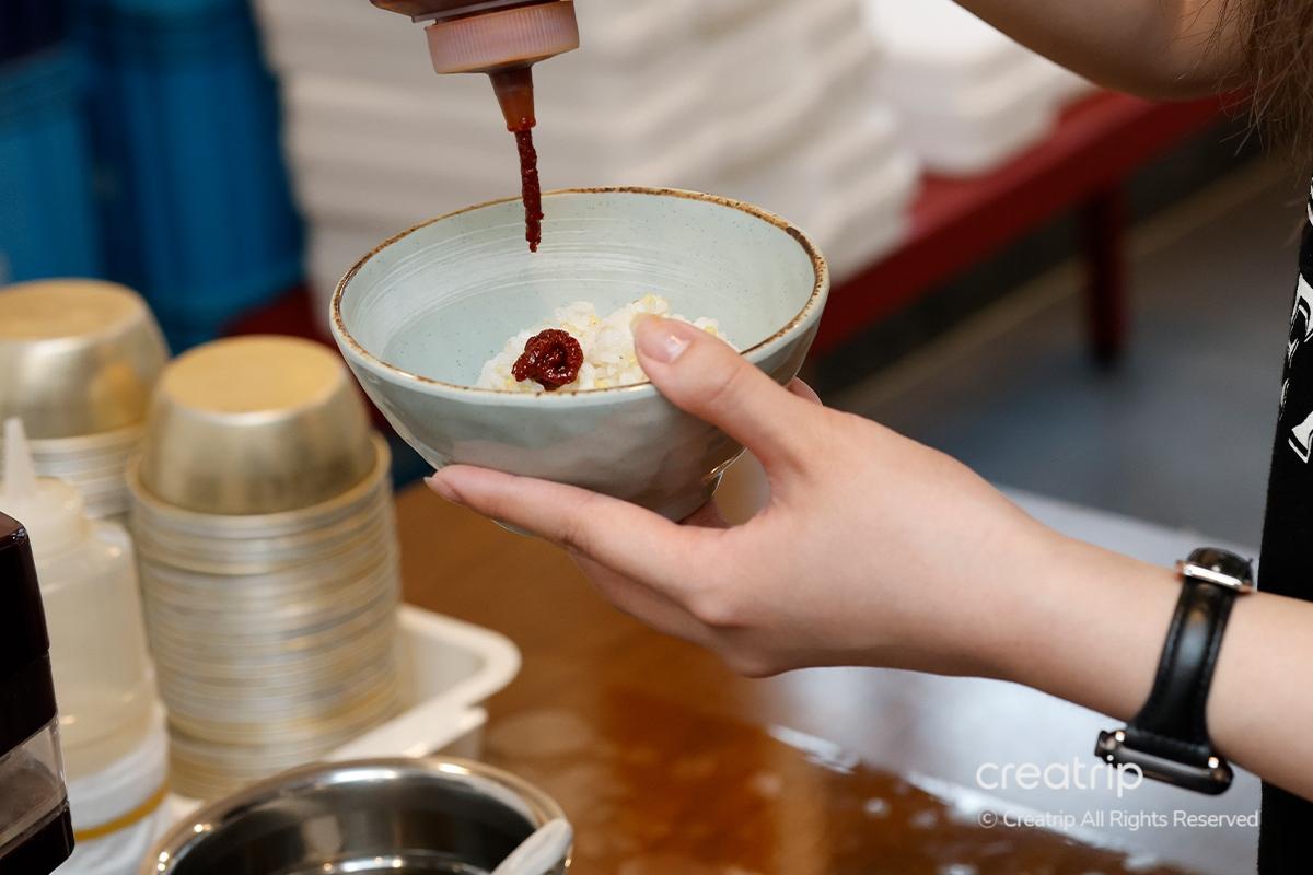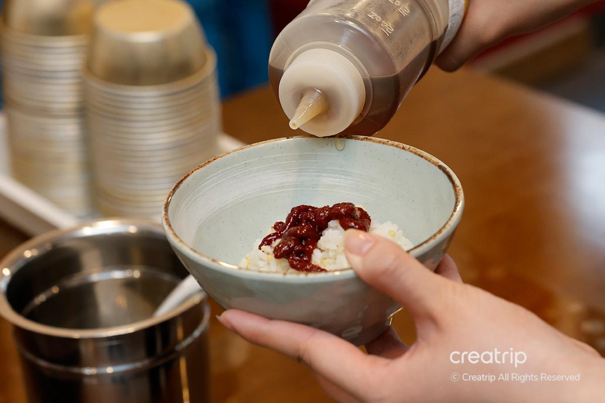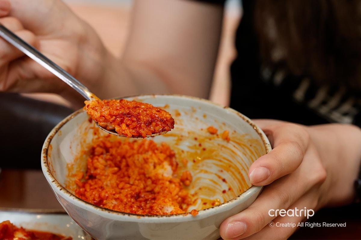 คุณสามารถผสมข้าวที่เตรียมไว้ที่บาร์บริการตัวเองกับโคชูจังและน้ำมันงาตามที่คุณชอบ ซึ่งช่วยให้คุณปรับความเผ็ดได้ตามรสชาติที่ต้องการ ดังนั้นมันจึงเรียบง่ายแต่