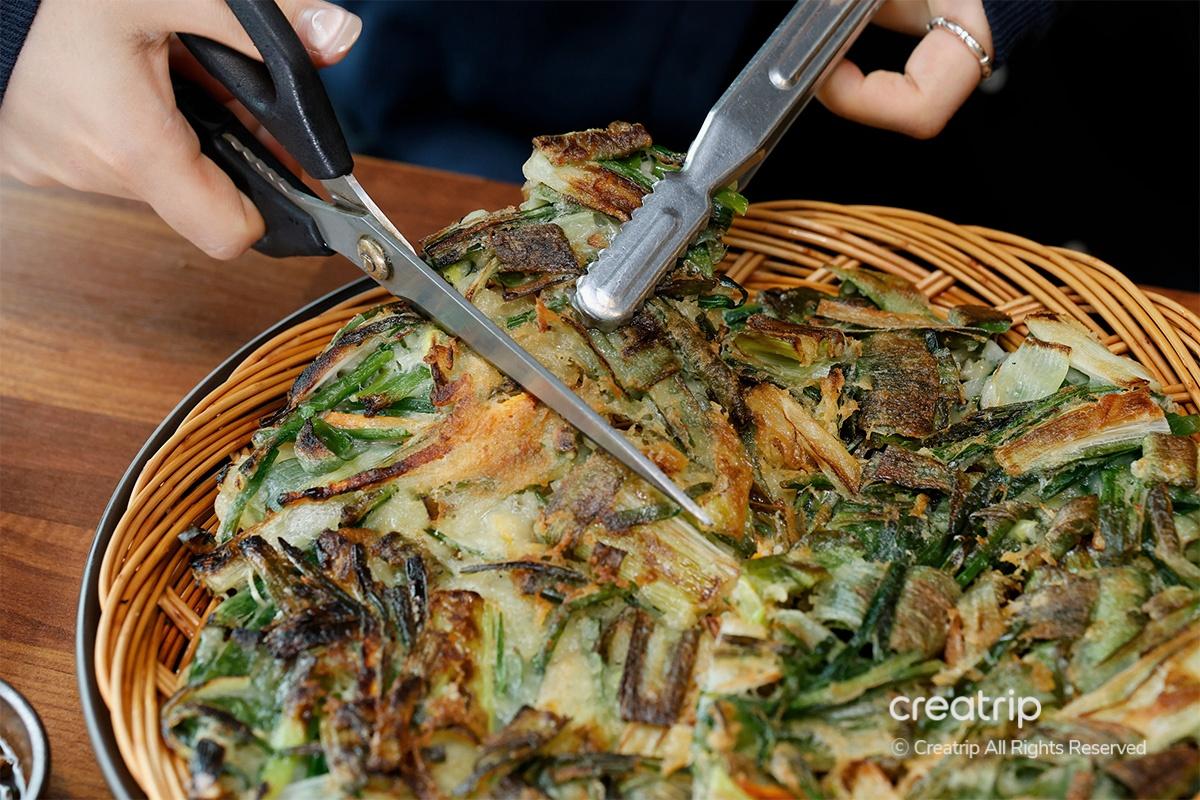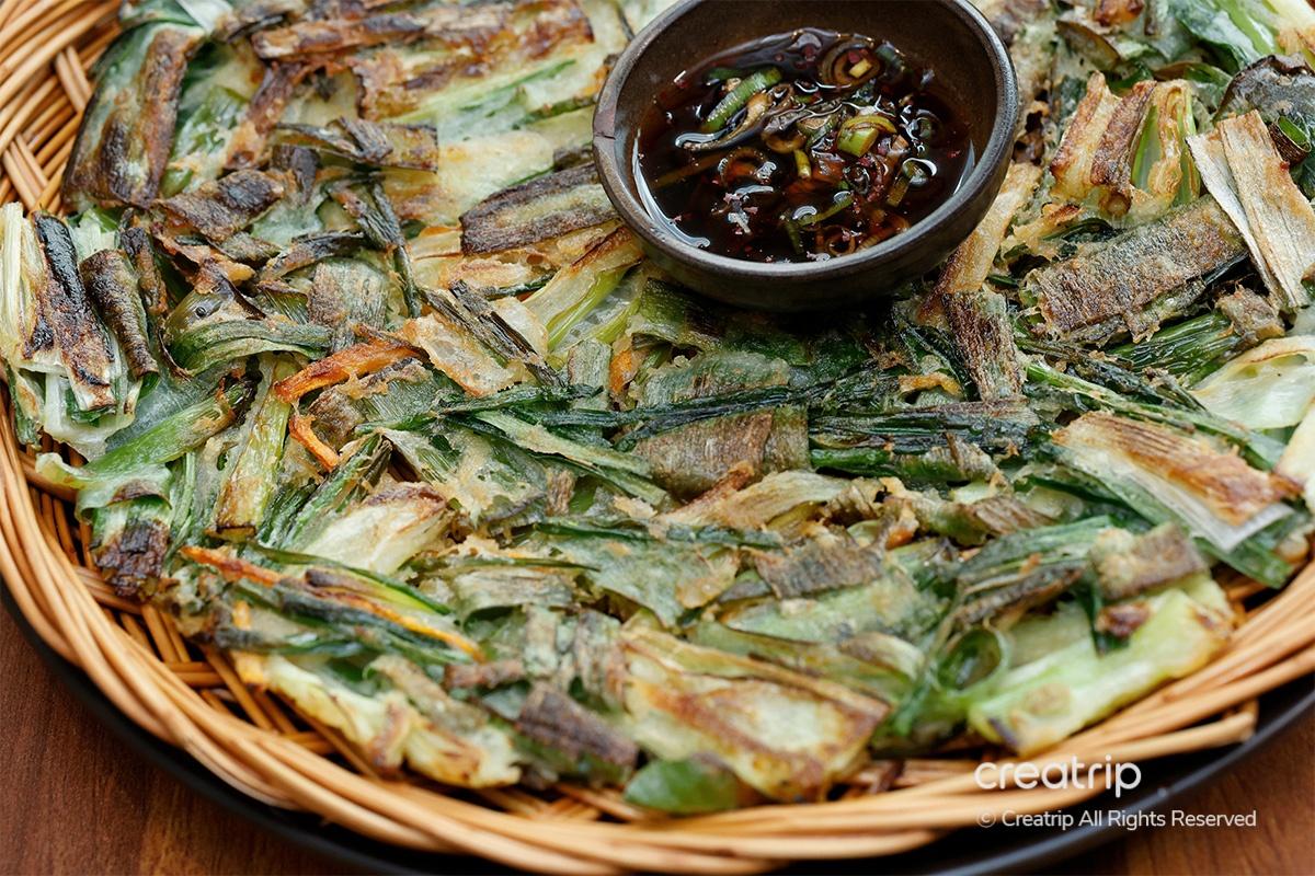 แพนเค้กที่อัดแน่นไปด้วยต้นหอม ด้านนอกกรอบ ด้านในชุ่มฉ่ำ—เนื้อสัมผัสน่าประทับใจจริง ๆ