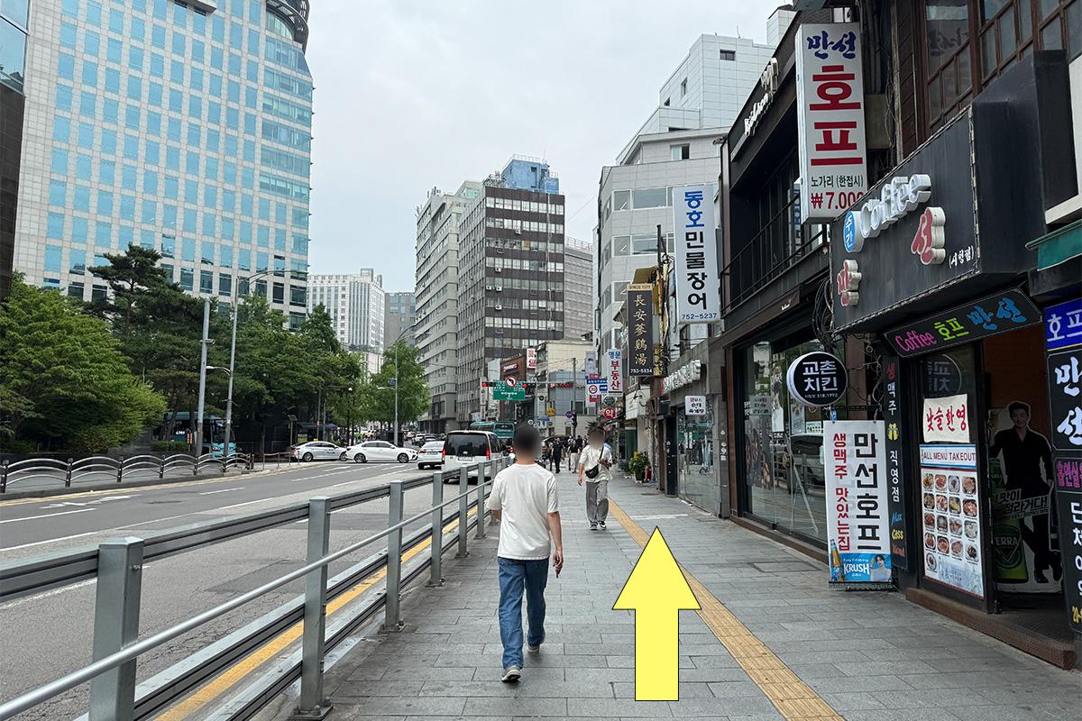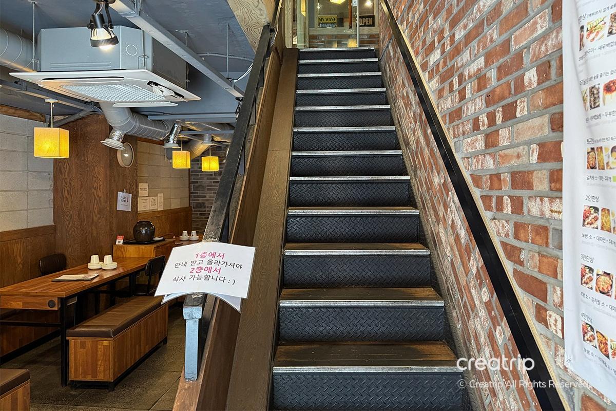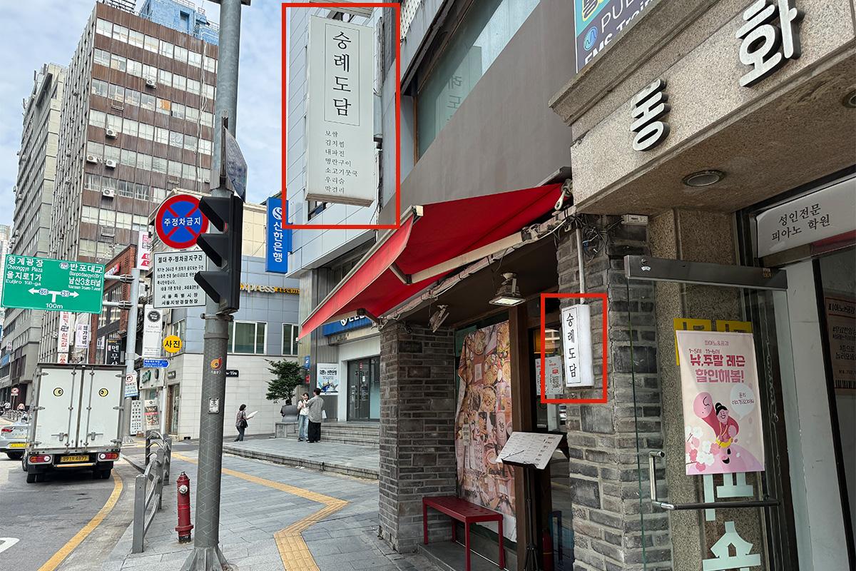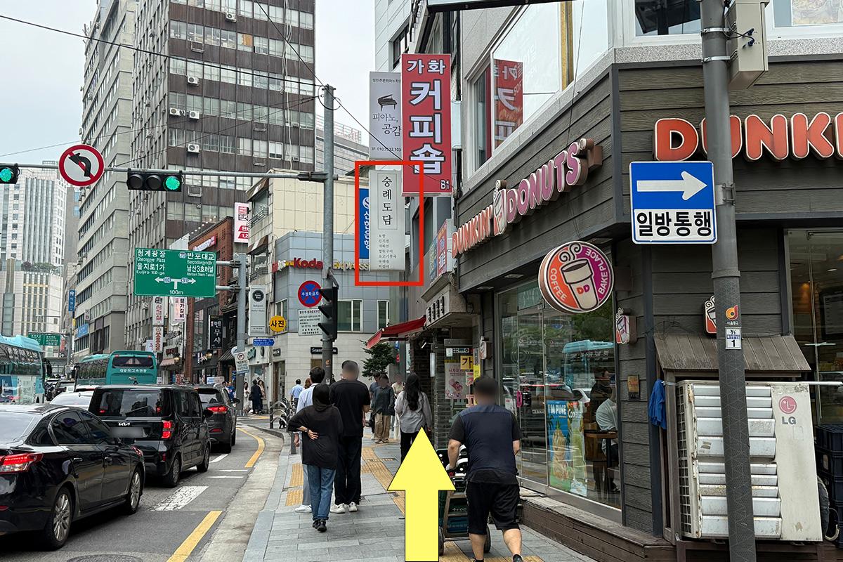 เดินตรงไปจนกว่าคุณจะเห็นป้าย 'Sungnye Dodam' หลังจากผ่าน Dunkin' Donuts