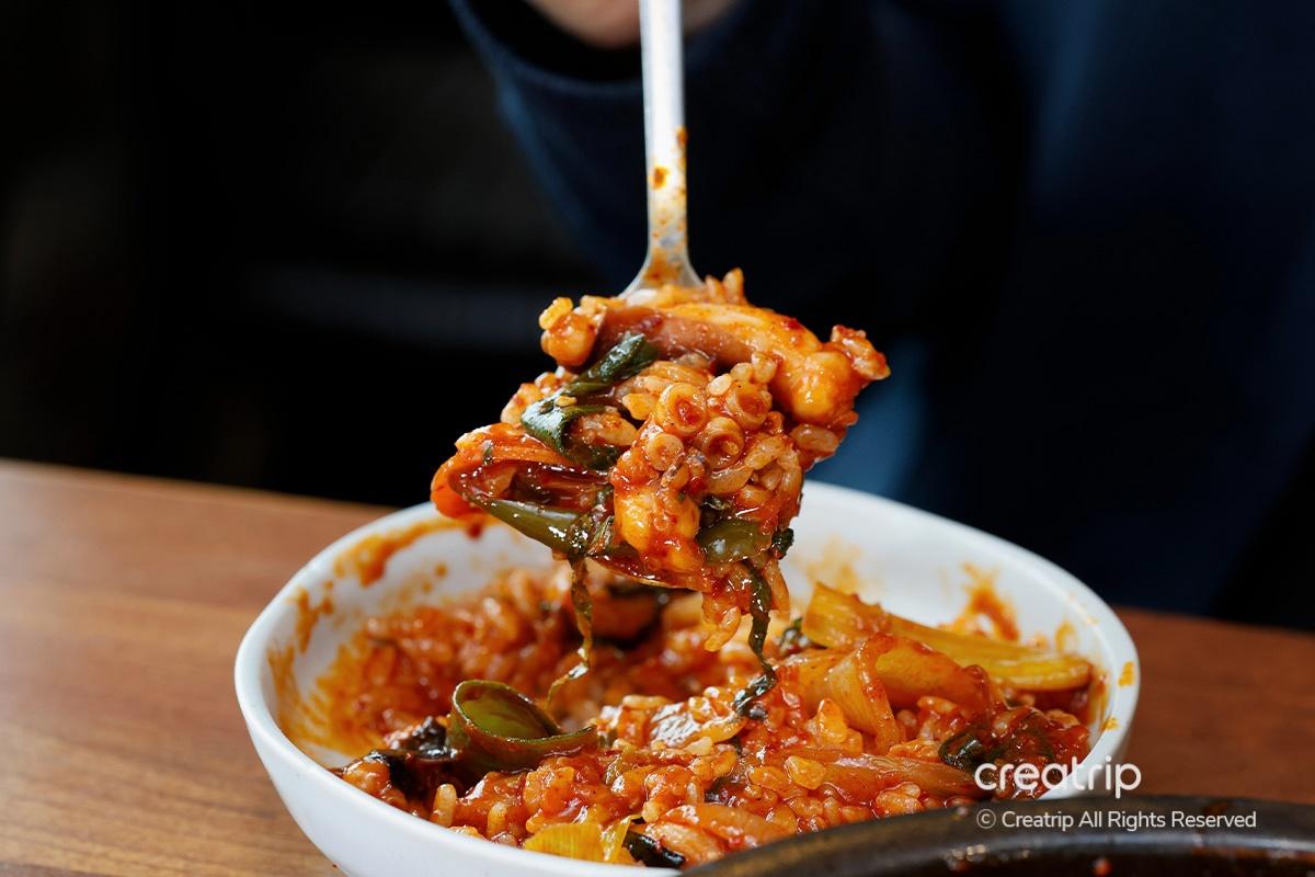 เครื่องปรุงรสเผ็ดซึมซาบเข้าไปในทุกเม็ดข้าว และเมื่อรับประทานพร้อมกับเนื้อหนึบของปลาหมึก จะได้มื้ออาหารที่อิ่มอร่อยและน่าพึงพอใจอย่างแท้จริง