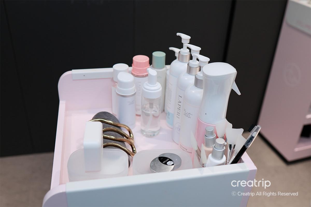 อุปกรณ์ เครื่องมือ และผลิตภัณฑ์บำรุงผิวถูกจัดเรียงอย่างเป็นระเบียบ ทำให้รู้สึกว่าสิ่งทุกอย่างสะอาดถูกสุขลักษณะและมีการจัดการอย่างเป็นระบบ