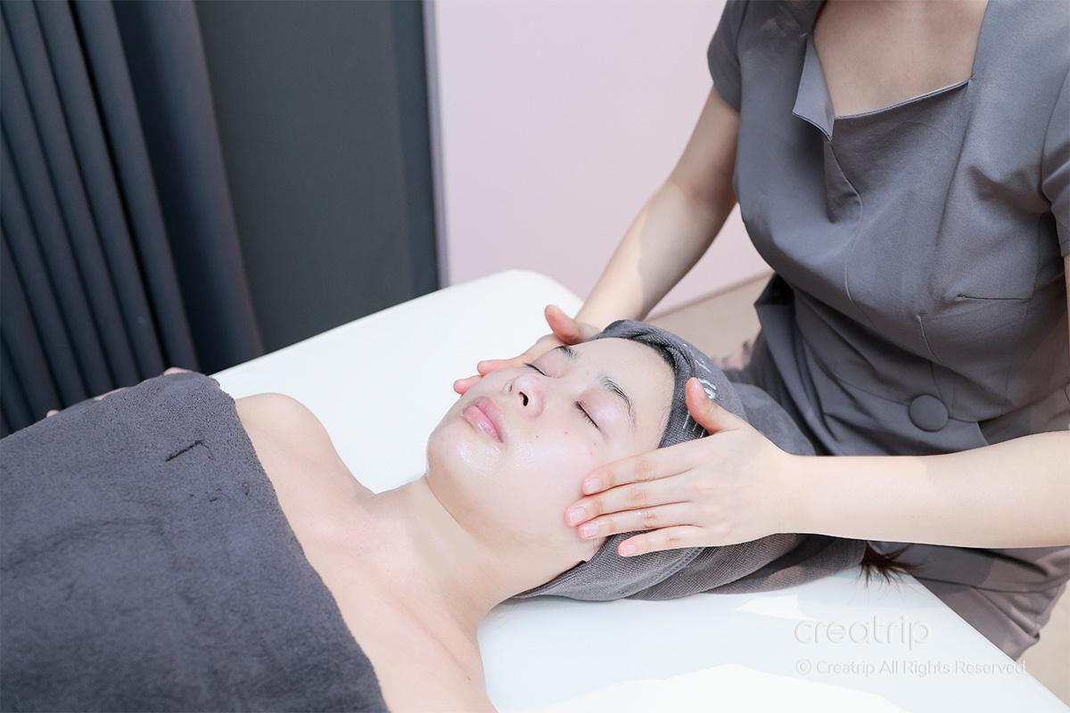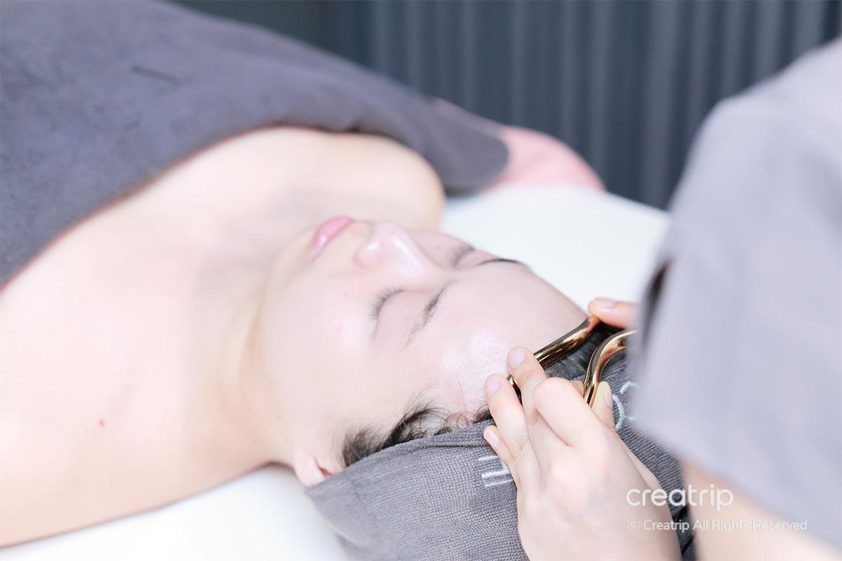 นักบำบัดใช้ทั้งสองมือกดอย่างละเอียดตามแนวใบหน้าแล้วยกขึ้นไปด้านบนขณะที่ทำทรีตเมนต์