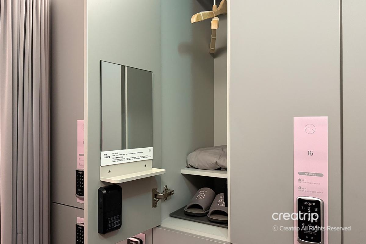 ต่อมา พนักงานพาฉันไปยังห้องเปลี่ยนเสื้อผ้า มีล็อกเกอร์ส่วนตัวพร้อมรหัสผ่าน จึงสามารถเก็บของได้อย่างปลอดภัย