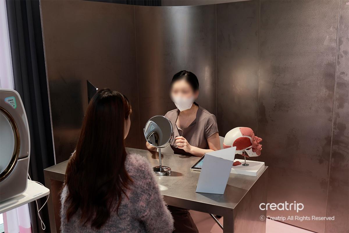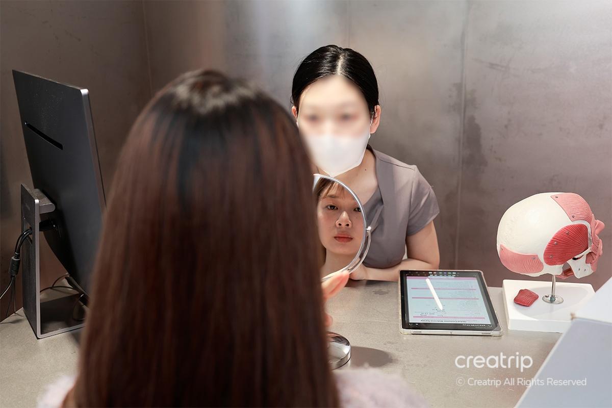 หลังจากกรอกแบบสอบถามแล้ว นักบำบัดวิเคราะห์รูปโครงหน้าให้ทีละส่วนขณะที่ฉันมองกระจก พร้อมอธิบายแนวทางที่ออกแบบตามรูปหน้าและแนะนำเทคนิคการนวดมือ ทำให้ทุกอย่างเข้าใจได้ง่าย