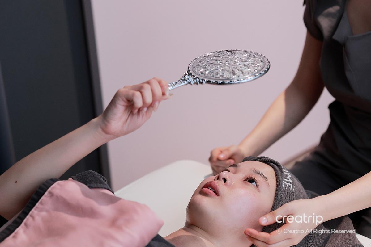 หลังจากทำความสะอาด ผู้นวดยกกระชับมอบกระจกจิ๋วให้ฉันและช่วยให้ฉันตรวจดูใบหน้าอีกครั้งก่อนเริ่มการรักษาหลัก