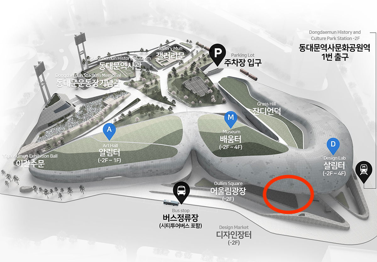 ด้านหน้าหอศิลป์ DDP มีป้ายรถเมล์ที่คุณสามารถขึ้นรถบัส Yellow Balloon City Bus ได้! รถบัส Yellow Balloon City Bus ออกเดินทางจาก DDP และไปที่ Blue House, ตลาดนัมแดมุน, อินซาดง, และสถานที่อื่นๆ พาคุณไปยังสถานที่ในเมืองและสถานที่ดั้งเดิมของกรุงโซล เหมาะสำหรับผู้ที่มาเยือนกรุงโซลครั้งแรก