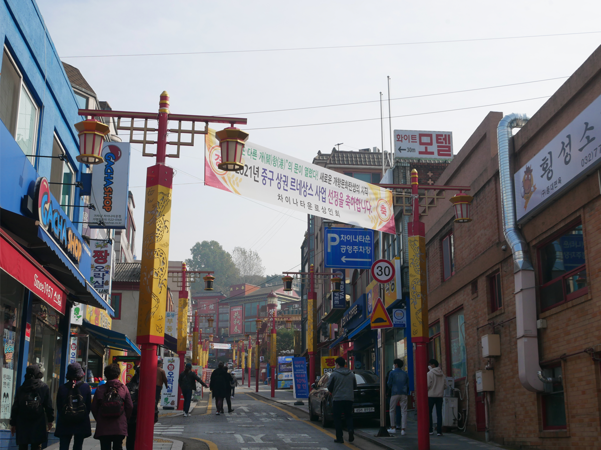 จากทางออก 1 ของสถานีอินชอน จะเห็นประตูทางเข้าสไตล์จีนขนาดใหญ่ตั้งอยู่ที่ฝั่งตรงข้าม โดยด้านบนมีคำว่าไชน่าทาวน์เขียนอยู่ นอกจากนี้ยังเป็นจุดท่องเที่ยวที่ทุกคนจะนึกถึงเมื่อพูดถึงอินชอน ฉะนั้นพลาดที่จะแวะมาเที่ยวไม่ได้เลย