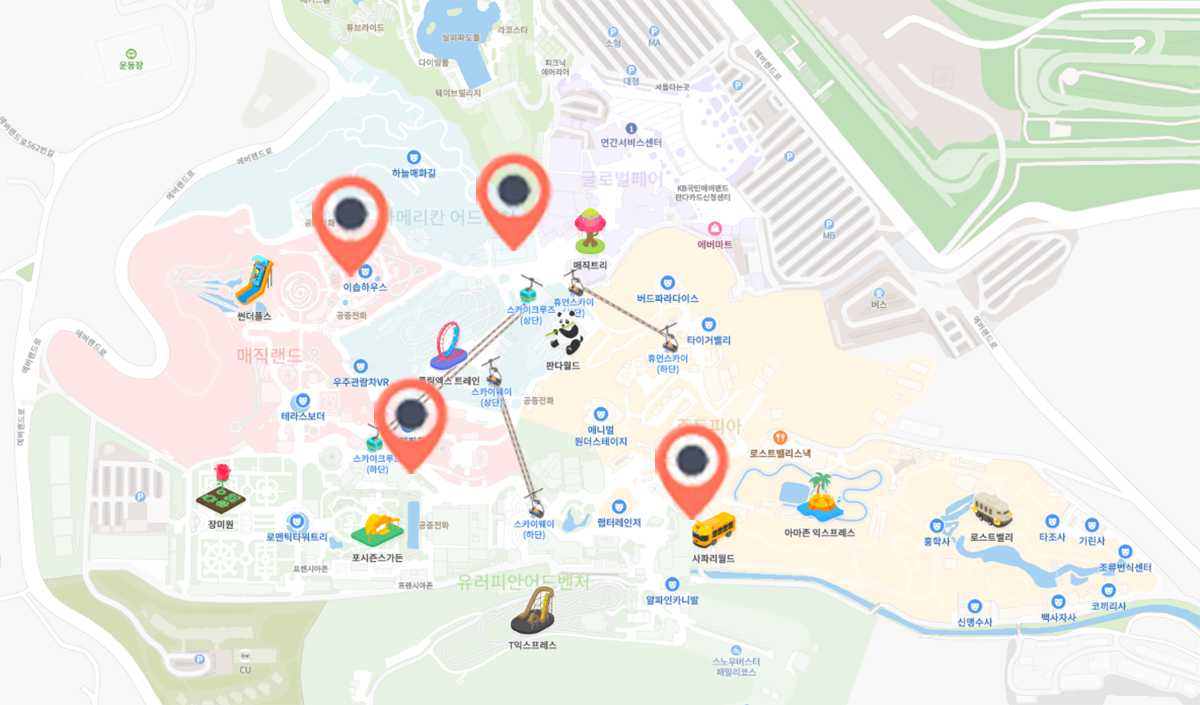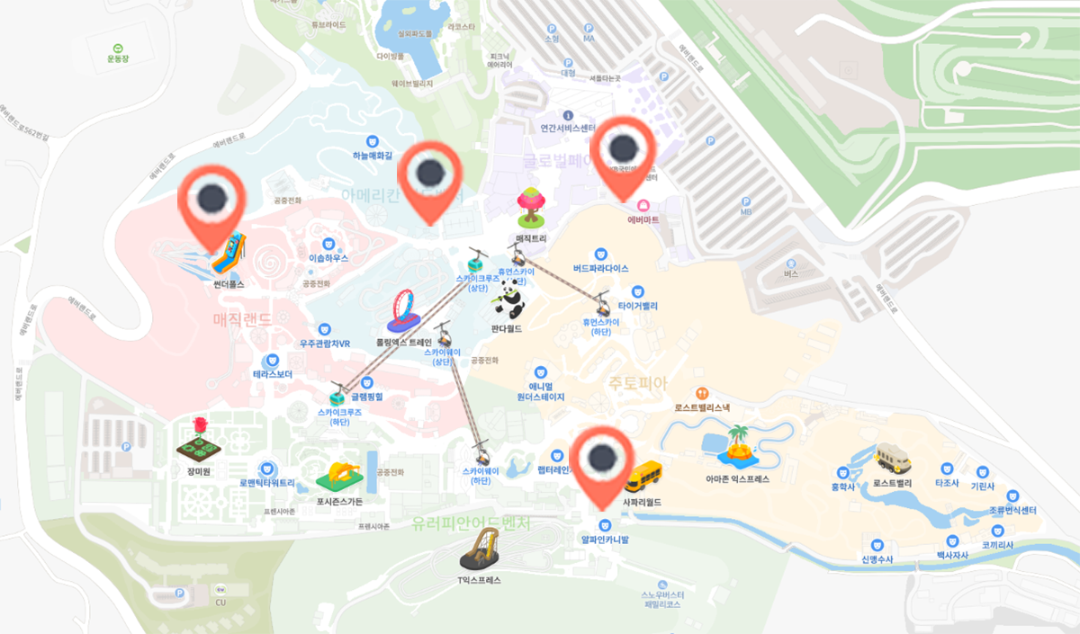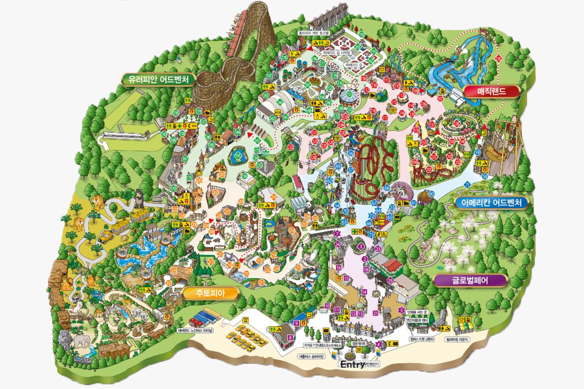 ก่อนอื่น เพื่อไม่ให้คุณหลงทางในสวนสนุกที่กว้างใหญ่นี้ ขอแนะนำแต่ละส่วนของสวนสนุก Everland ประกอบไปด้วยห้าโซน: European Adventure, Magic Land, American Adventure, Global Fair, และ Zootopia