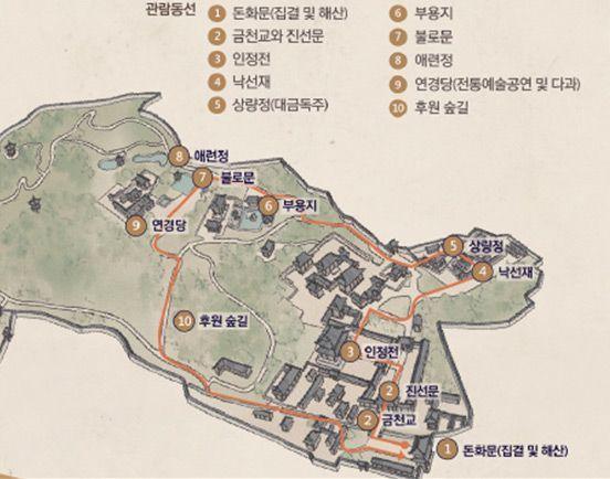 - คอร์สทัวร์ : ประตูทนฮวามุน (ทางเข้า) → สะพานคึมชอนกโยและประตูชินซอนมุน → หออินจองจอน → ศาลานักซอนแจ → ศาลาซังนยังจอง (ชมการแสดงขลุ่ยไม้พื้นเมือง) → สระน้ำพูยงจี → ประตูบุลลอมุน → ศาลาอินจองจอน → หอยอนคยองดัง (การแสดงศิลปะโบราณ & ช่วงเวลาการดื่มชา) → สวนลับฮูวอน → ประตูทนฮวามุน (ทัวร์)