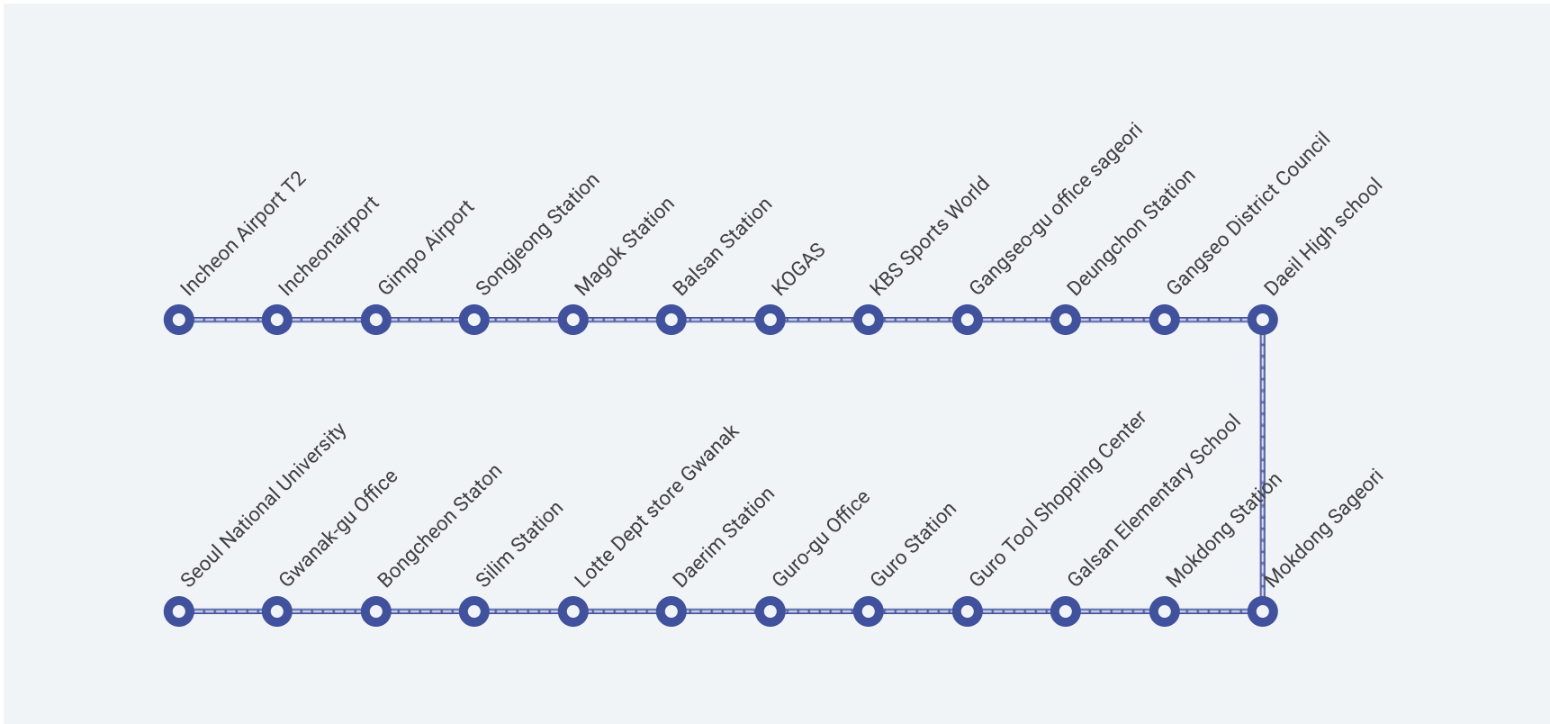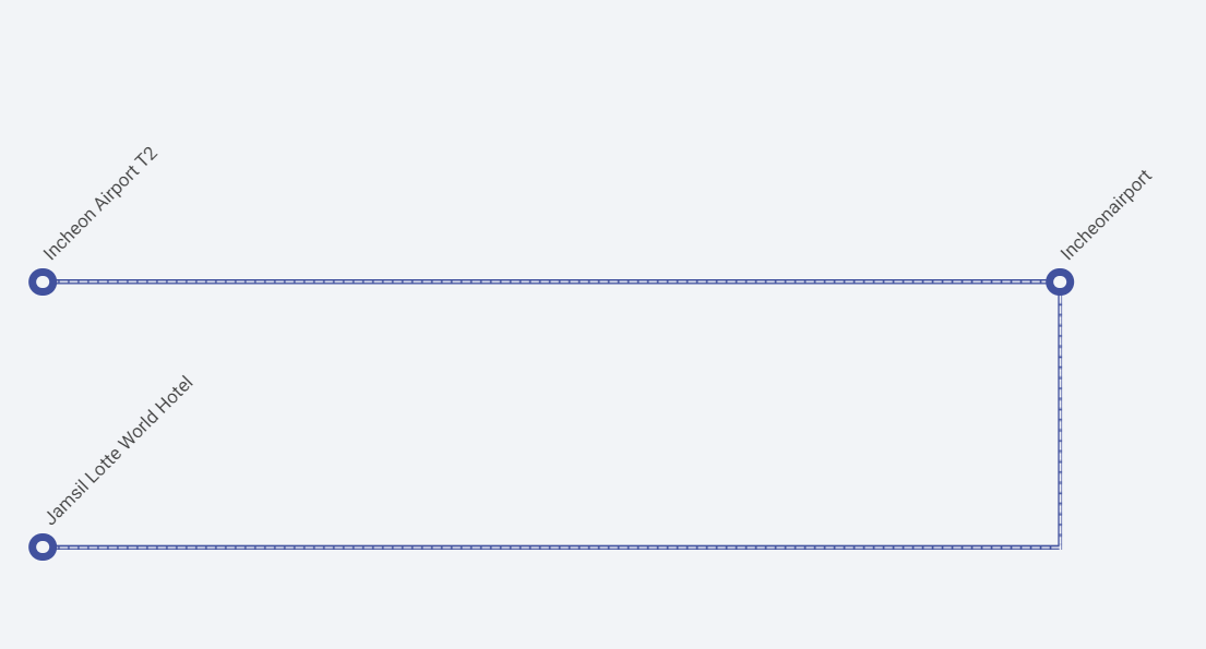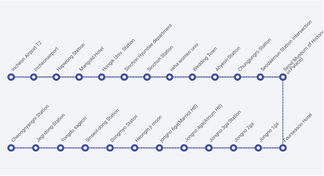 | ออกเดินทางจากสนามบินอินชอน T2 | สนามบินอินชอน T1 | สนามบินกิมโป | ฮงแด | สถานีโซล |