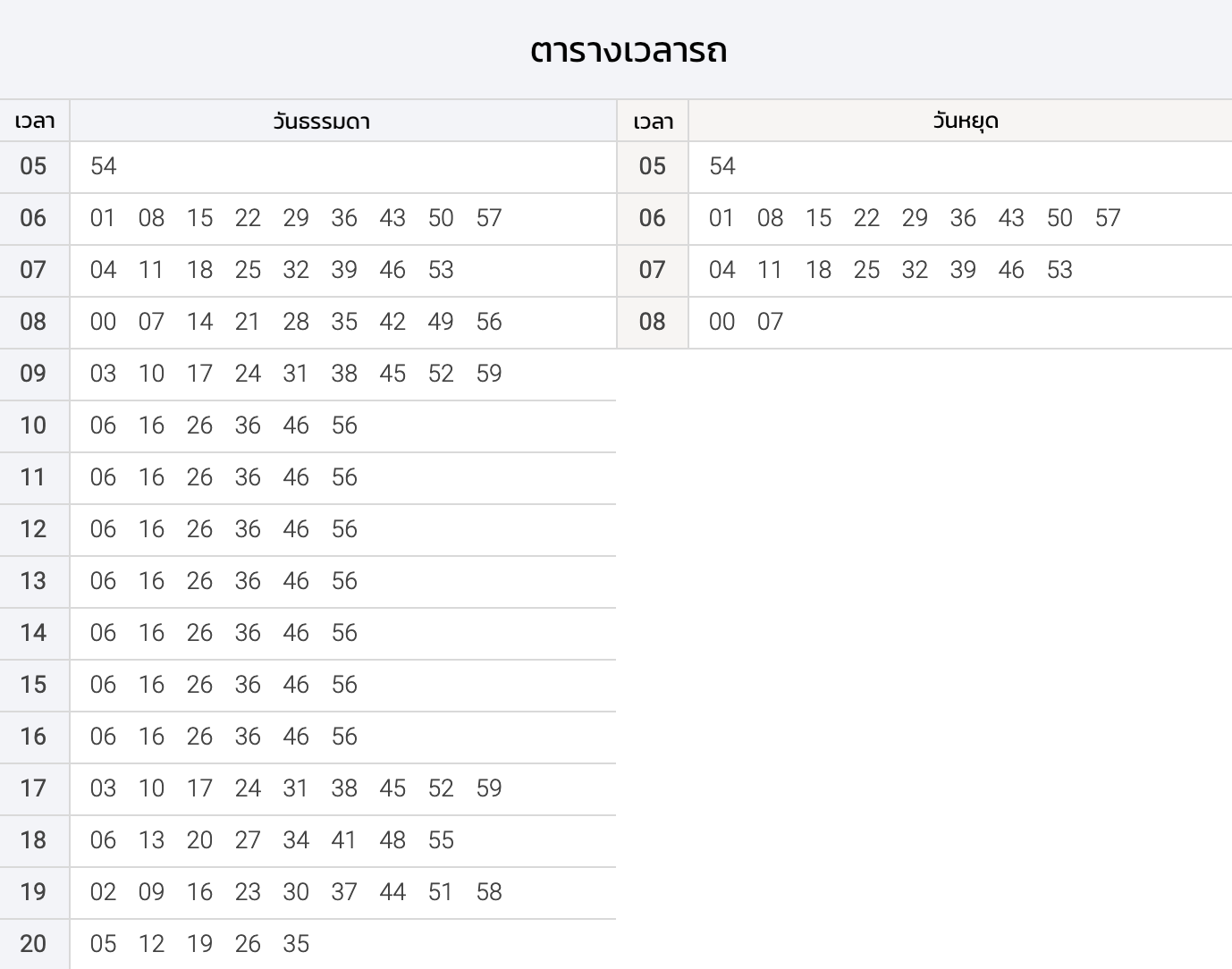 วันจันทร์-ศุกร์ | วันหยุดสุดสัปดาห์ (เวลา 7:00 - 9:00) / วันหยุดนักขัตฤกษ์ | วันจันทร์-ศุกร์ | วันหยุดสุดสัปดาห์ (เวลา 7:00 - 9:00) / วันหยุดนักขัตฤกษ์ | |