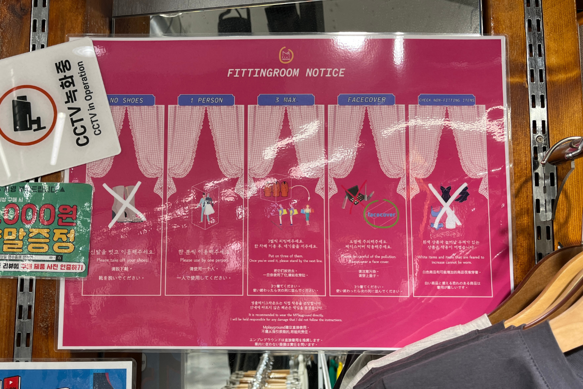 มีห้องลองเสื้อผ้ามากมายในแต่ละชั้น คุณจึงไม่ต้องรอนาน มีกฎบางอย่างเมื่อคุณลองเสื้อผ้า: คุณต้องถอดรองเท้าก่อนเข้าห้องลองเสื้อผ้า, มีเพียงคนเดียวที่สามารถเข้าไปในห้องลองเสื้อผ้าได้ครั้งหนึ่ง, คุณสามารถลองเสื้อผ้าได้สูงสุด 3 ชิ้นในแต่ละครั้ง, คุณต้องสวมหน้ากากเมื่อคุณลองใส่เสื้อผ้า, และสุดท้ายนี้, คุณไม่สามารถลองเสื้อผ้าสีขาวหรือเสื้อผ้าที่มีแนวโน้มว่าจะยืดได้.