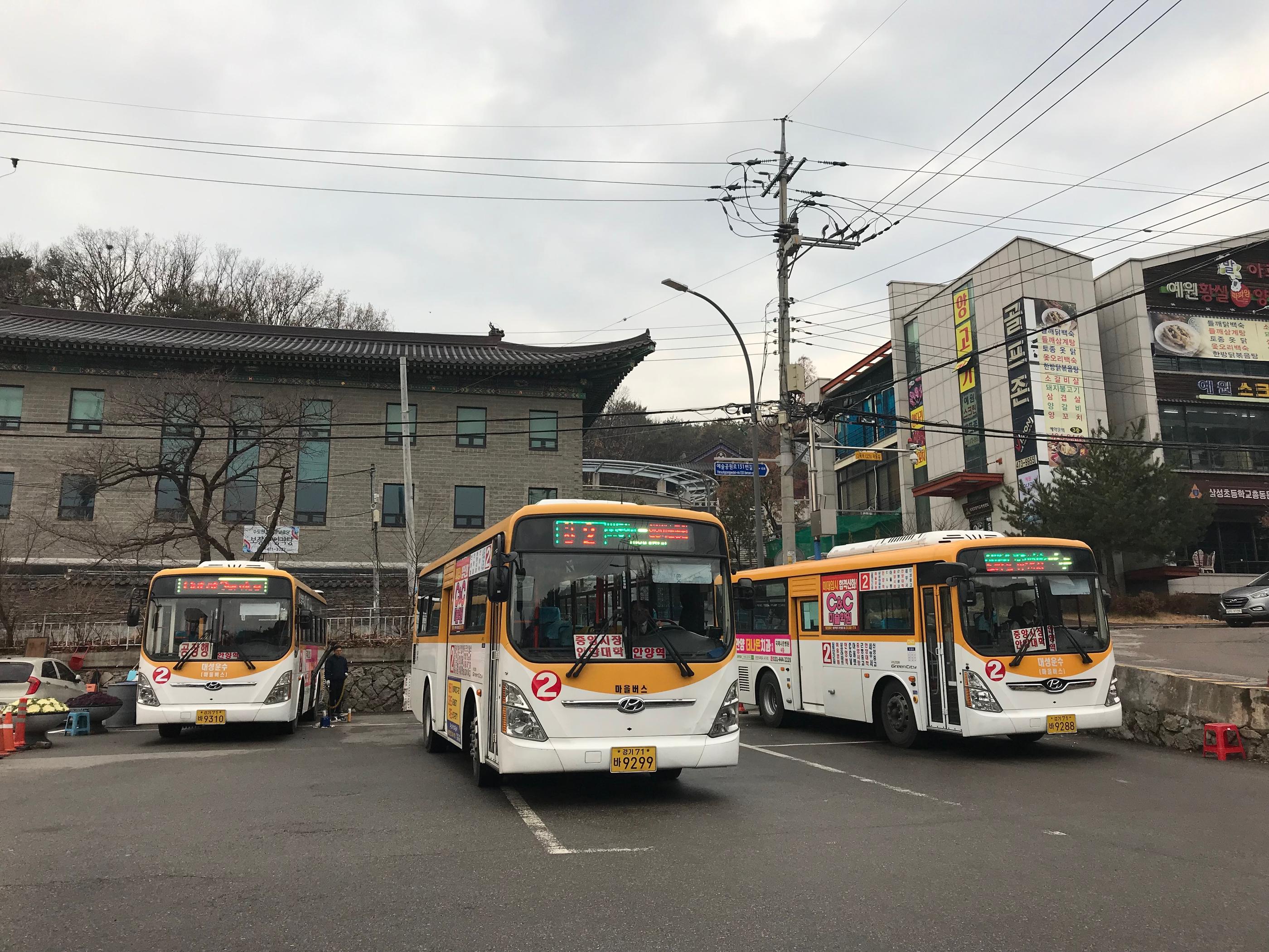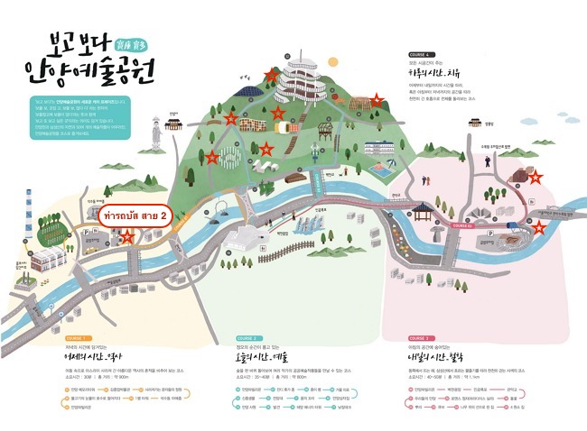 - วิธีเดินทาง : เดินออกจากทางออก 1 ของสถานีอันยาง (안양역) แล้วเลี้ยวซ้ายเดินไปยังป้ายรถเมล์หน้าร้าน Starbucks จากนั้นรอรถบัสสาย 02 และนั่งไปยังป้ายสุดท้าย อันยางเยซุลคงวอนจงจอม (안양예술공원종점)