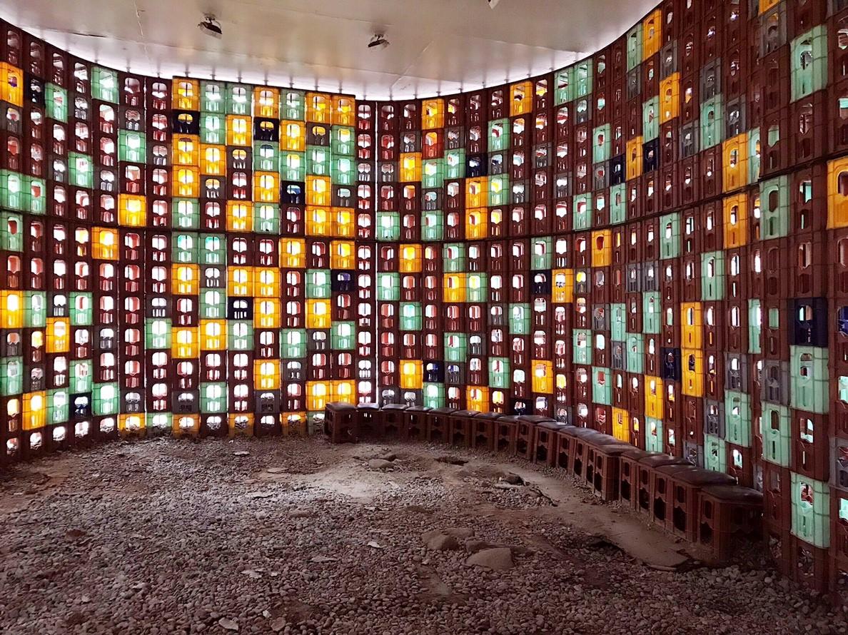 มองกันใกล้ๆทราบไหมคะว่างานศิลปะชิ้นนี้สร้างมาจากอะไร....? ลังใส่ขวดเบียร์นั่นเองค่ะ ถือว่าทั้งสร้างสรรค์และสามารถทำขยะมารีไซเคิลได้อีก แต่สามารถเดินเข้าไปที่ด้านในได้ถึงเวลา 6 โมงเย็นเท่านั้นนะคะ หากเดินทางมาหลังเวลาดังกล่าวจะไม่สามารถเข้าไปถ่ายรูปด้านในได้ค่ะ