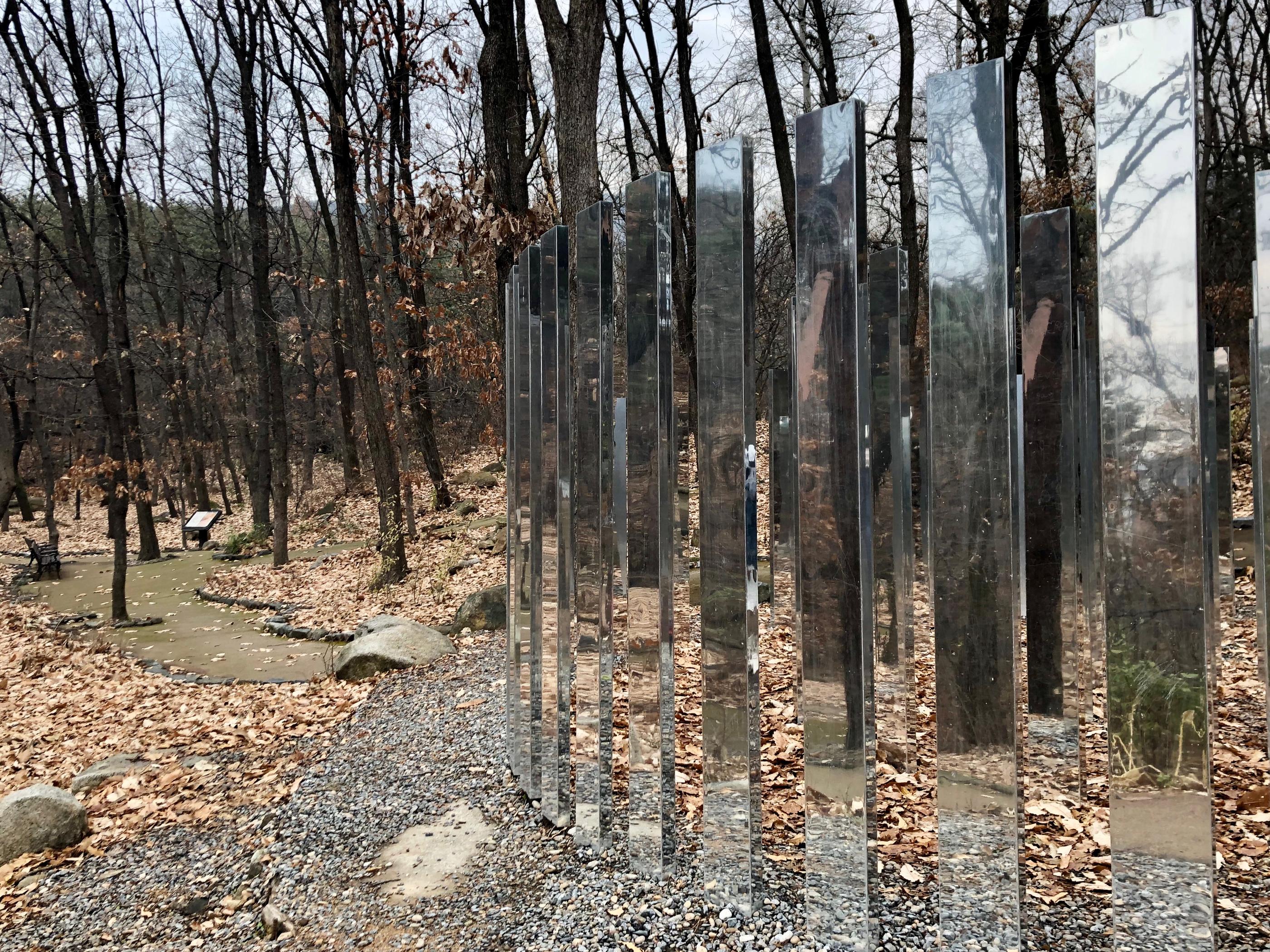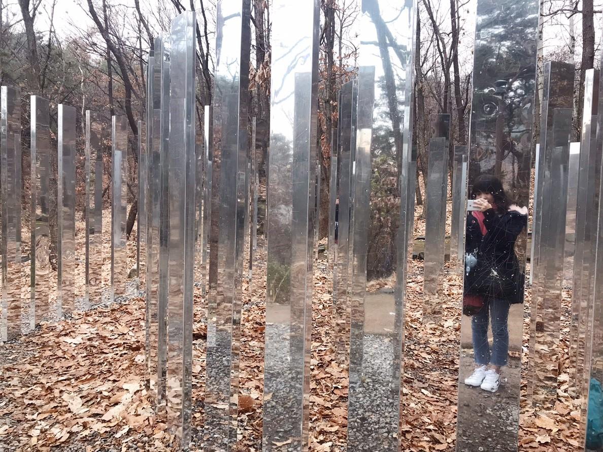หากเดินมาจากท่ารถบัสสาย 2 ตามแผนที่ด้านบน ผลงานแรกที่เราจะเจอคือ "Dimensional Mirror Labyrinth" เขาวงกตกระจกที่สะท้อนความงามของธรรมชาติรอบๆ และความงามของนางแบบในภาพเอาไว้ได้อย่างงดงาม