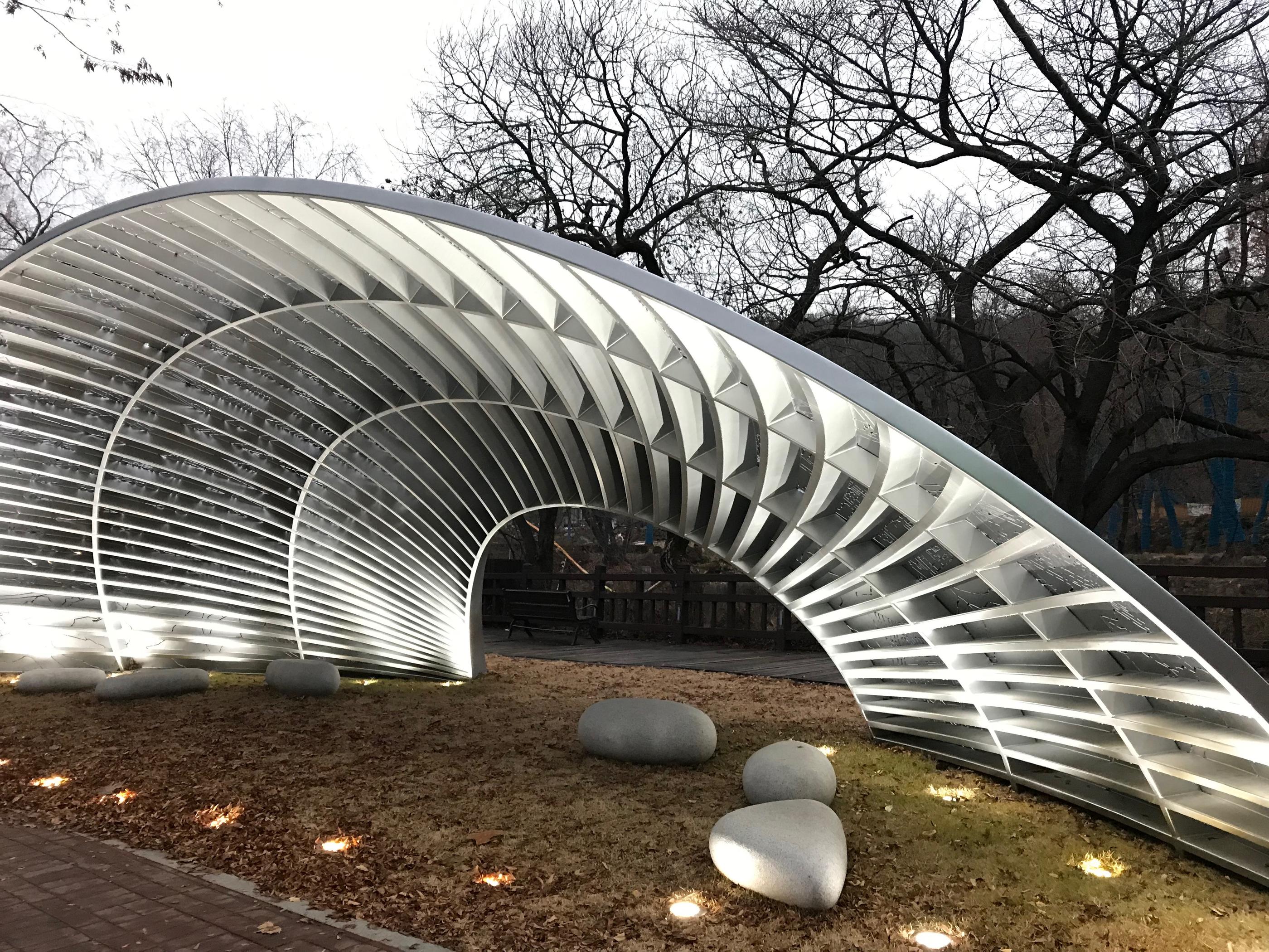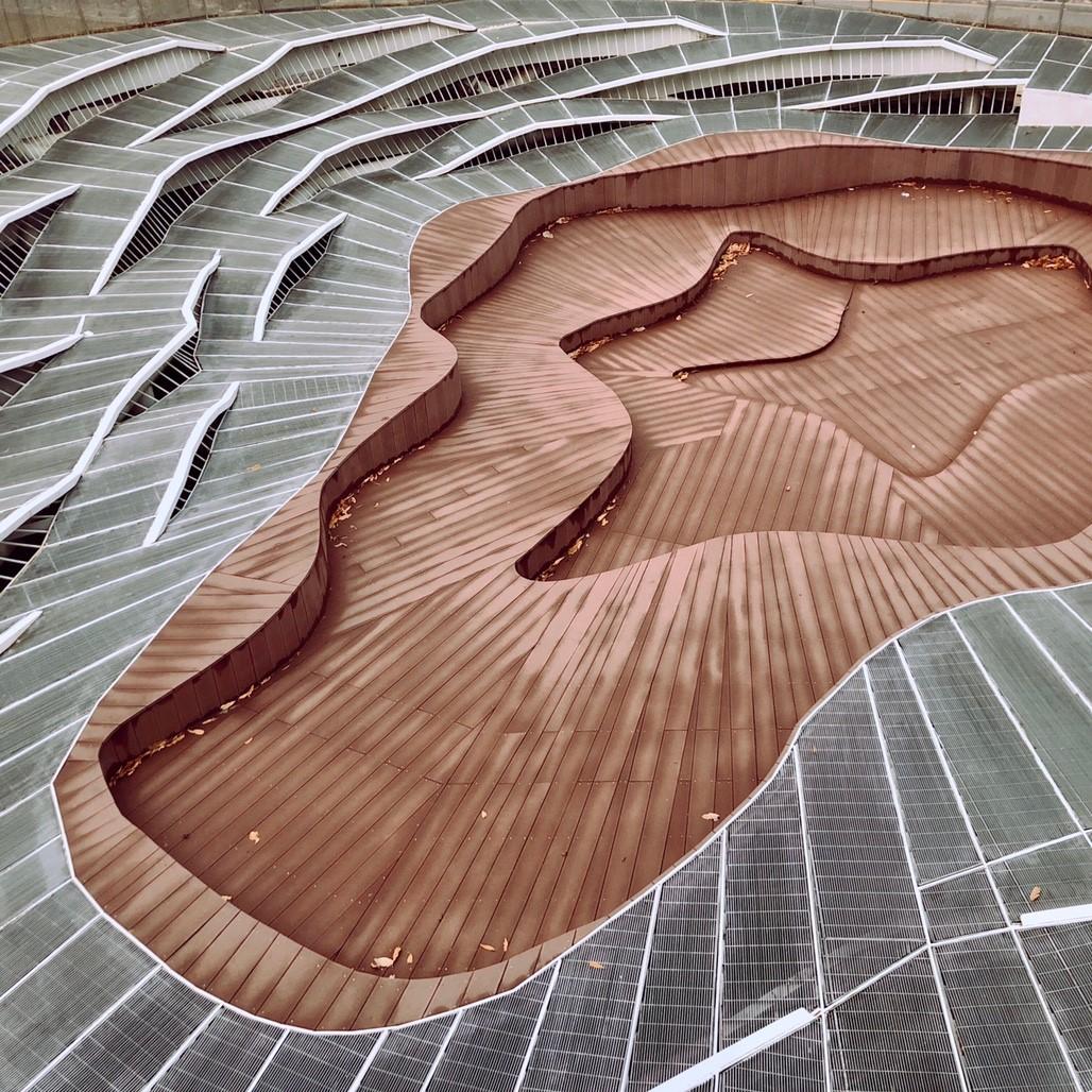 เมื่อเดินมาจนสุดอุโมงค์ก็จะเจอกับลานกว้างพร้อมกับทางเดินหรือที่นั่ง? ที่เป็นคลื่น มุมที่เรียกว่าฮิตที่สุดของสวนแห่งนี้เลยก็ว่าได้ สายฮิปทั้งหลายไม่ควรพลาดเลยค่ะ