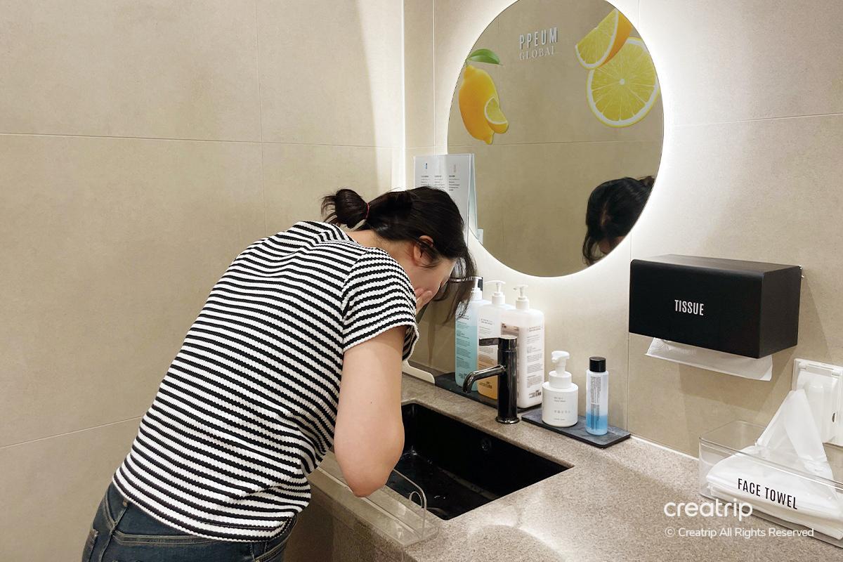แม้ว่าจะดีที่สุดถ้ามาถึงโดยไม่มีเครื่องสำอางสำหรับการทำทรีตเมนต์ แต่ไม่ต้องกังวลหากคุณแต่งหน้าอยู่—คุณสามารถล้างหน้าของคุณได้อย่างง่ายดายในห้องแป้ง!
