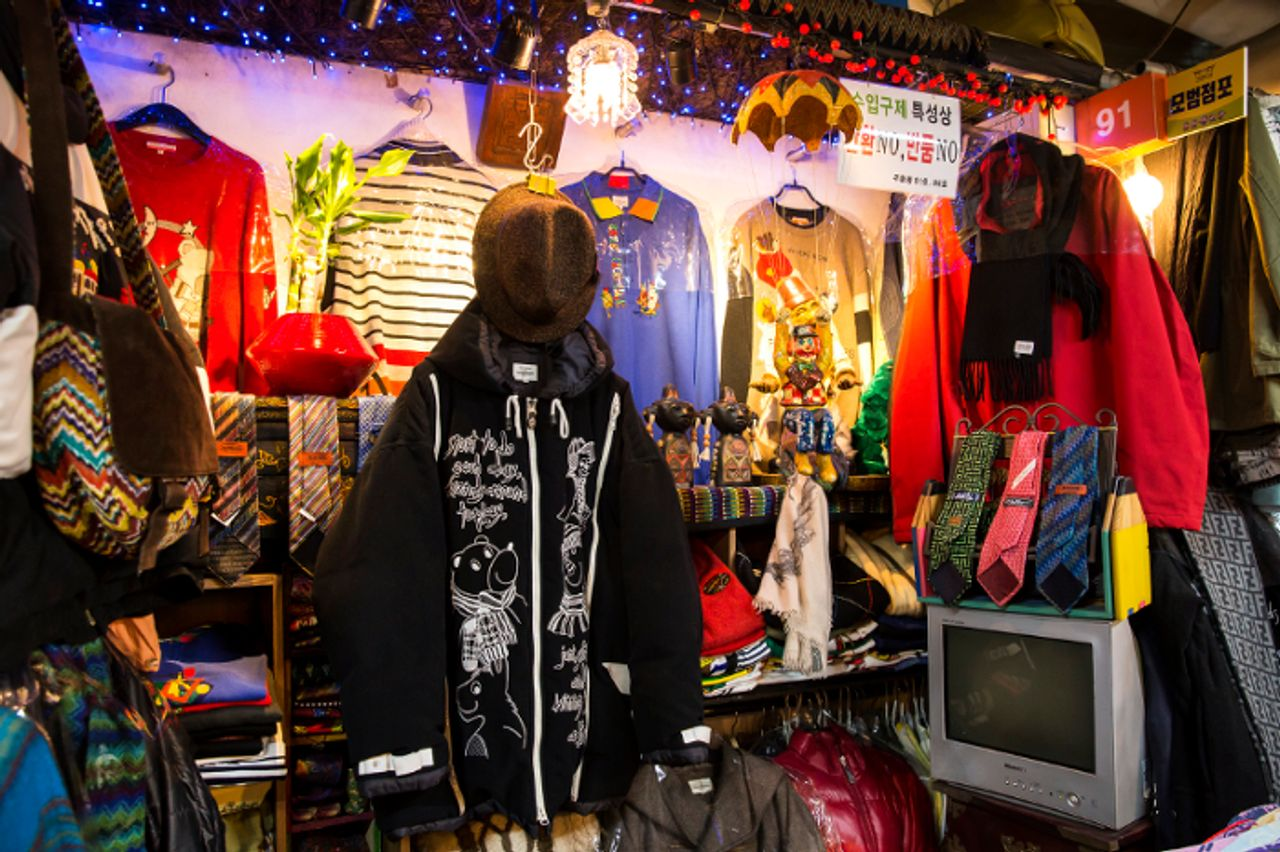ภาพของร้านขายเสื้อผ้าวินเทจในตลาดนัดโซลพร้อมผู้คนเดินเลือกซื้อสินค้าภาพของเสื้อโค้ทวินเทจแขวนเรียงในแผงร้านค้าที่ตลาดนัดมือสองในโซล