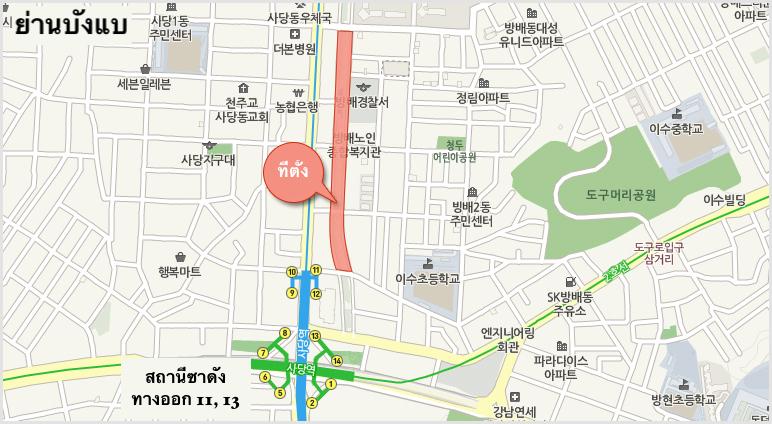 วิธีเดินทาง : สถานีซาดัง (사당역) ทางออก 11, 13