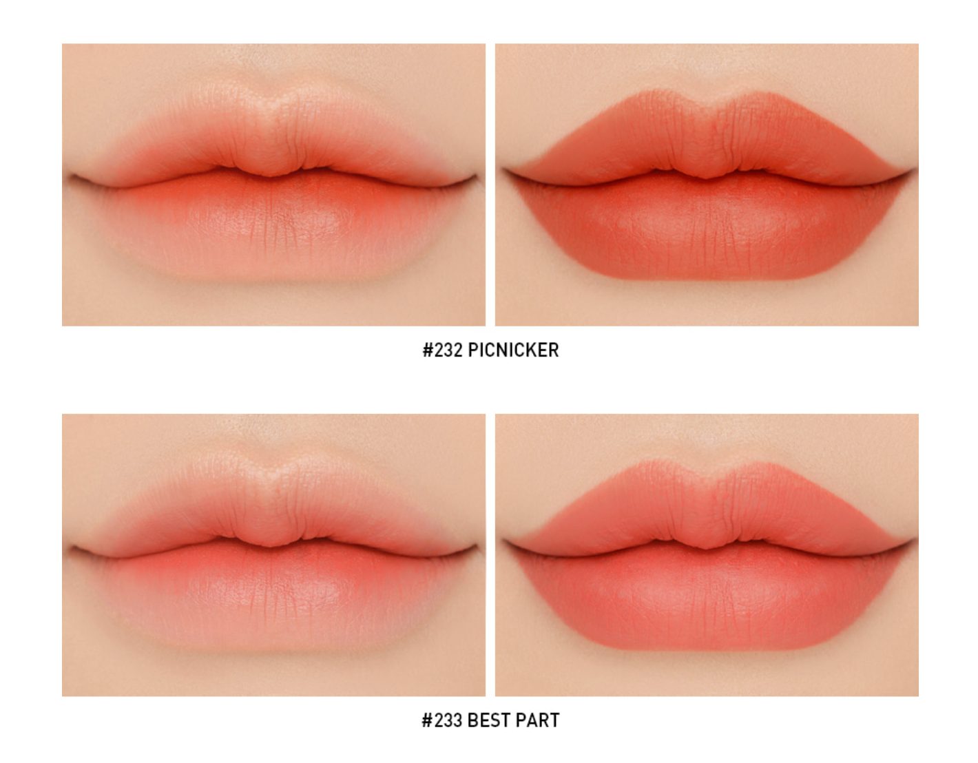 ตัวลิปเป็นเนื้อแมท สำหรับคนที่ปากแห้งไม่ค่อยแนะนำนะคะ เพราะว่าทาออกมาแล้วอาจดูปากแตกได้ แต่บอกเลยว่าสีสวยทั้ง 2 สีเลยละค่ะ สำหรับคนที่ชอบโทนส้มแนะนำ #232 Picnicker เลยค่ะ ส่วนคนที่ชอบอมชมพูหน่อยๆแนะนำเป็น #233 Best Part ค่ะ