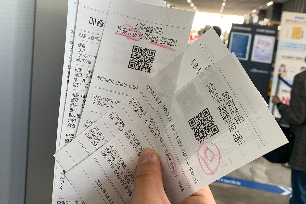 ถ้าซื้อแพ็คเกจ Sky Capsule (เที่ยวเดียว) + รถไฟชายหาด (Free Use) ราคา 50,000 วอนสำหรับ 2 คน จะทำให้สามารถเพลิดเพลินในราคาที่สมเหตุสมผลได้! หรือถ้าซื้อ Sky Capsule (เที่ยวเดียว) + Beach Train (ครั้งเดียว) แบบเรา ก็นั่งได้ 44,000 วอนสำหรับ 2 คน!