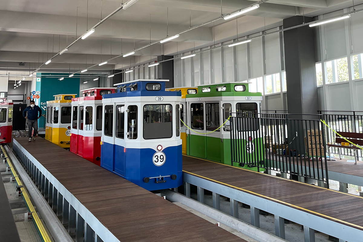 เรารอประมาณ 35 นาทีรถไฟสาย Sky Capsules ที่มีสีสันสดใสและน่ารักมากๆ แต่เนื่องจากมันทำงานคล้ายกับชิงช้าสวรรค์ (ขึ้นและปิดในที่เดียวกัน) ทำให้ดูช้ามากค่ะ