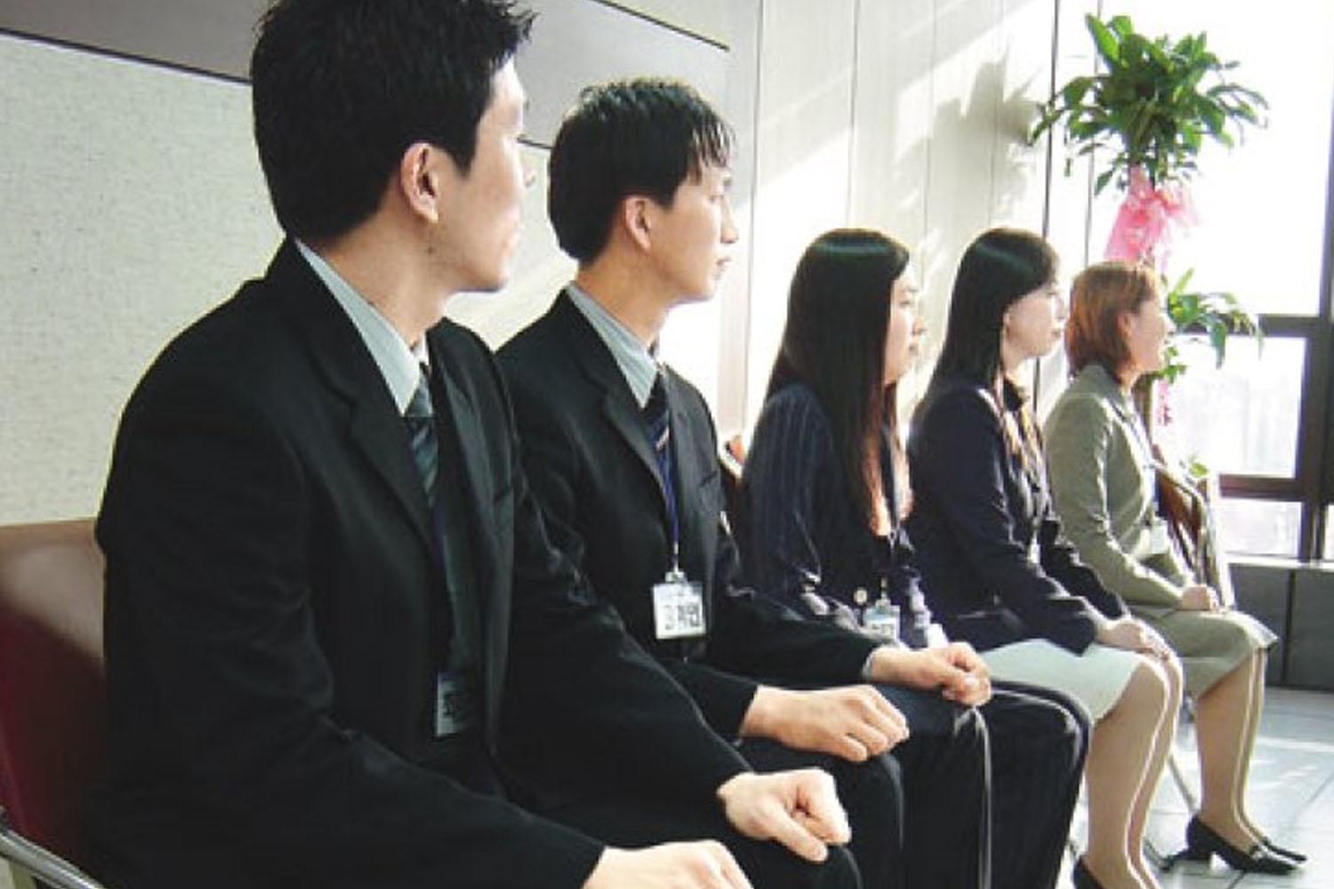 ภาพของผู้สมัครงานนั่งรอสัมภาษณ์ใส่ชุดทางการแสดงถึงกระบวนการและการเตรียมตัวก่อนการสัมภาษณ์ในเกาหลี