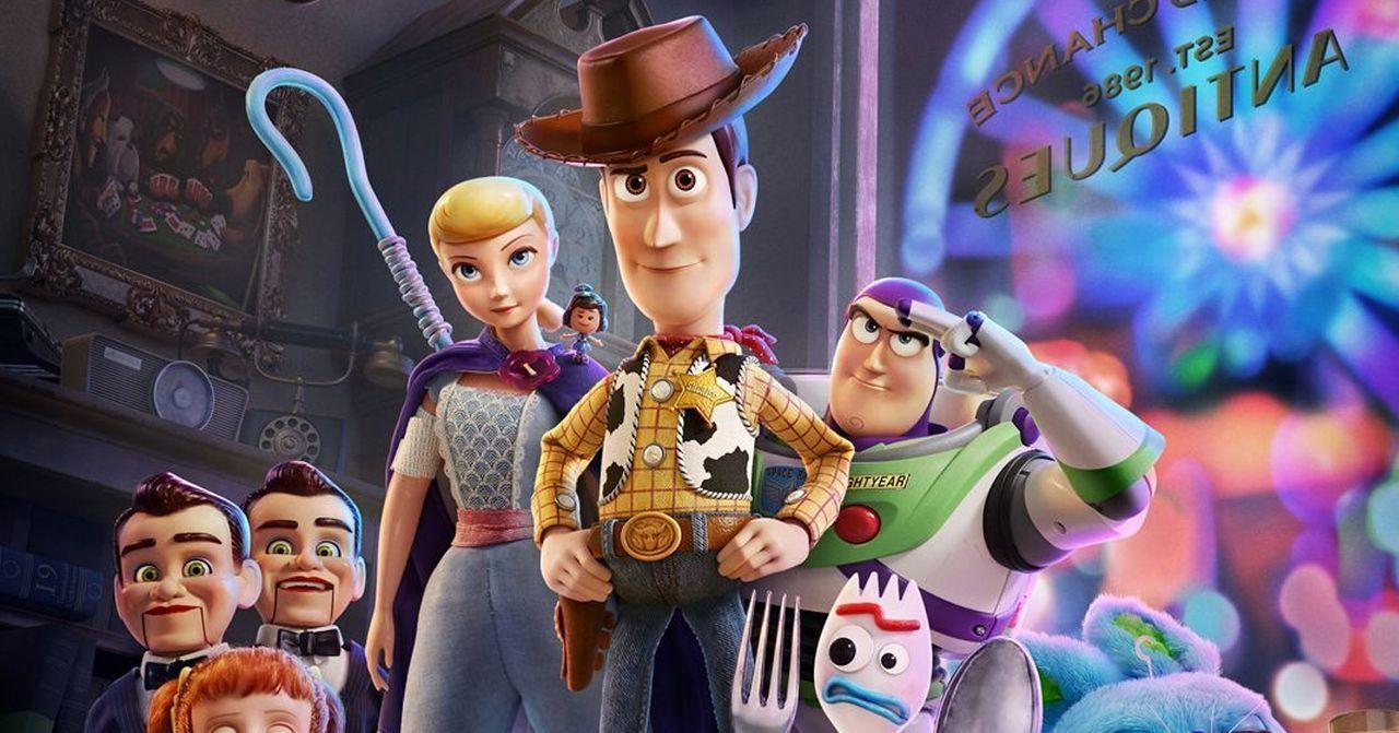 ภาพการ์ตูนดิสนีย์จากภาพยนตร์ทอยสตอรี่ 4 แสดงตัวละครเอก เช่น วู้ดดี้และบัซไลท์เยียร์ กับตุ๊กตาอื่น ๆ