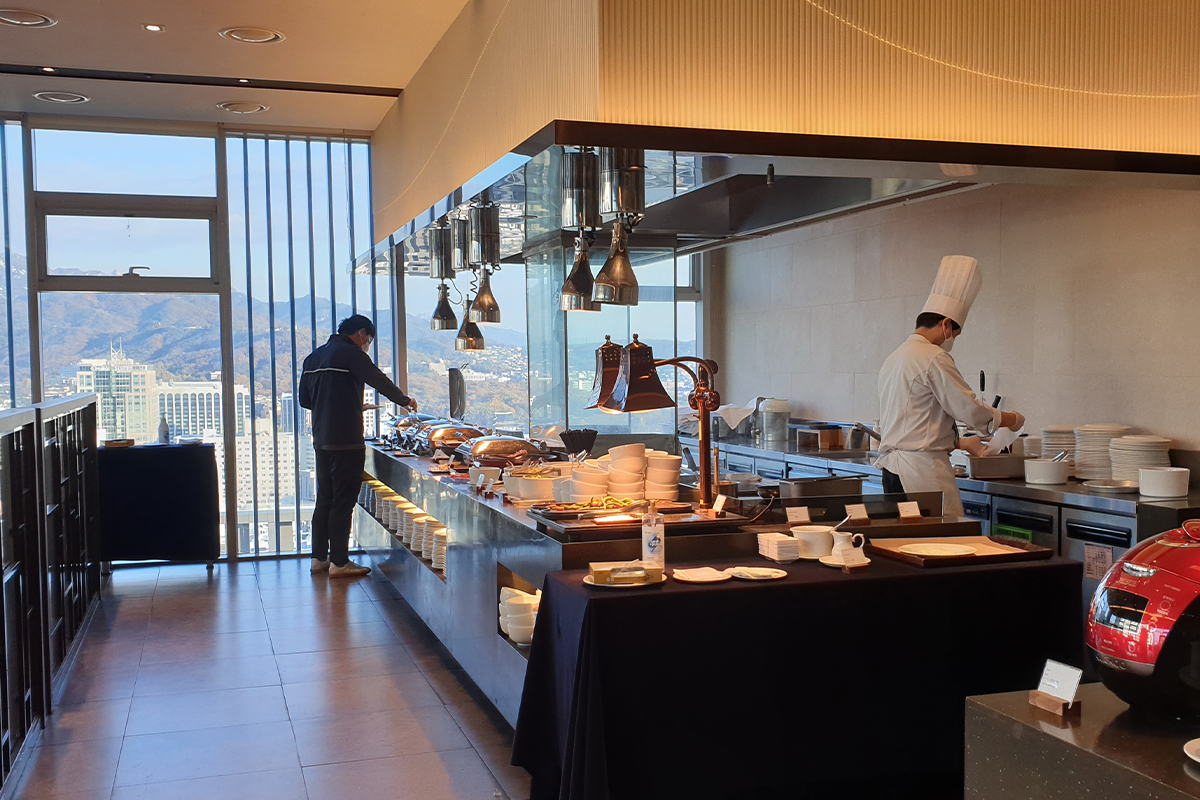 Nhà hàng phục vụ cả món ăn truyền thống Hàn Quốc và món ăn phương Tây. Ngoài ra còn có nhiều loại ngũ cốc và trái cây tráng miệng. Bạn có thể yêu cầu đầu bếp tráng trứng cho ngay tại chỗ nha!