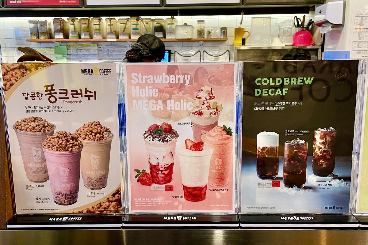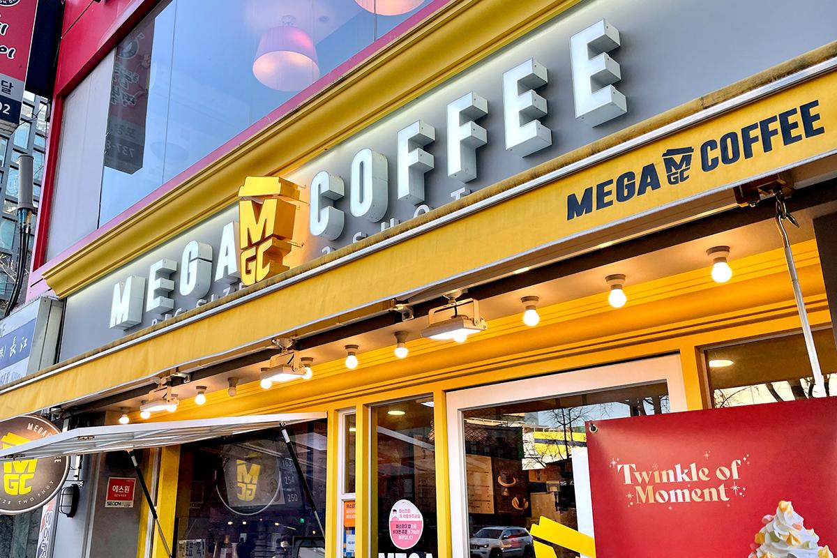 Mega Coffee, một thương hiệu cà phê giá rẻ tiêu biểu tại Hàn Quốc đã phát triển nhanh chóng kể từ khi khai trương chi nhánh Hongdae đầu tiên vào năm 2015. Nó có nội thất màu vàng nổi bật và một ki-ốt máy gọi đồ tự động bên ngoài giúp bạn đặt đồ mang về rất tiện lợi.
