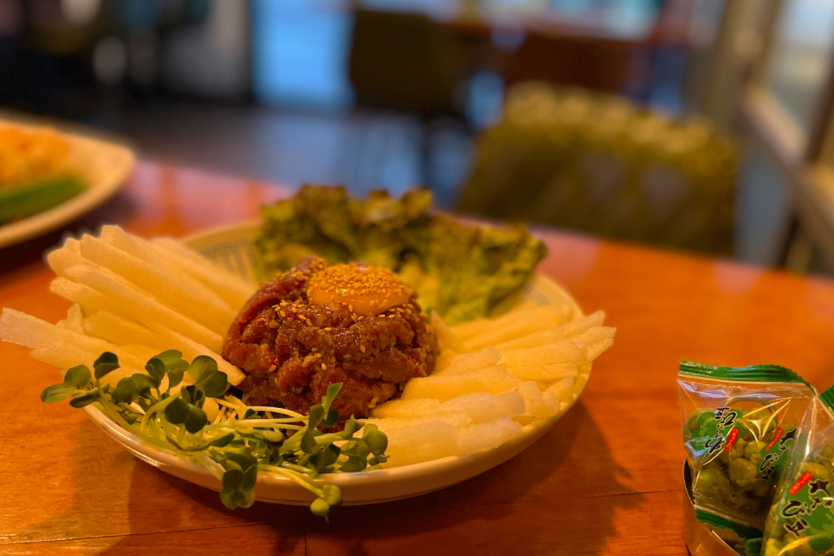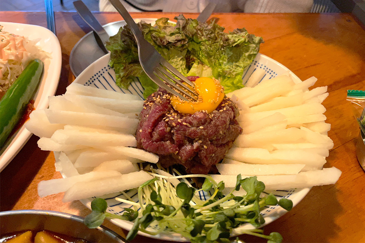 Gỏi thịt bò (yukhoe) cũng nổi tiếng là món nhắm rượu ngon nhất. Tuy giá có hơi đắt so với những loại đồ nhắm khác, nhưng vị dai dai của thịt khi uống cùng với rượu lại rất là hợp.