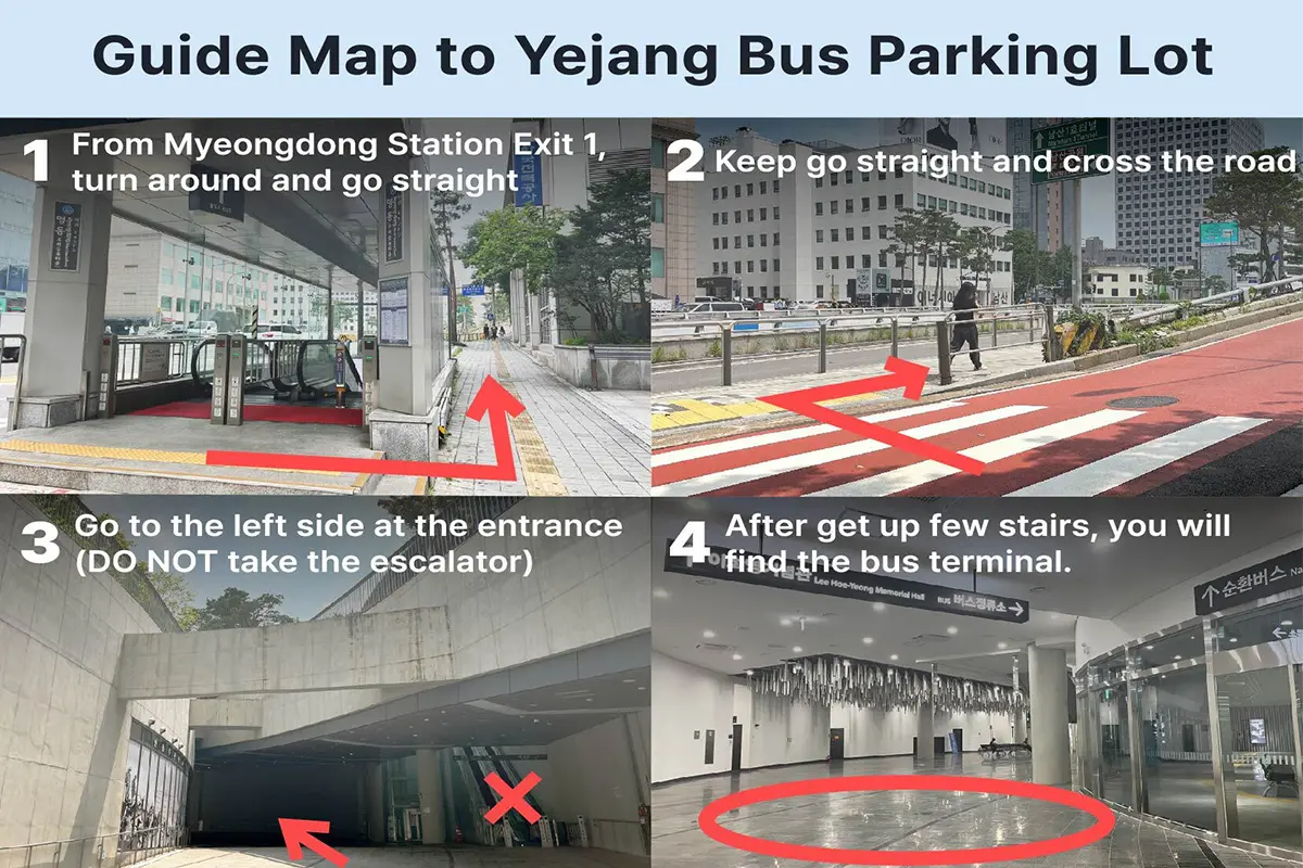 Bước 3 | Đến điểm khởi hành trước 10 phút. 07:20 Khởi hành ở cửa ra số 4 ga Hongdae 08:00 Khởi hành ở bãi đậu xe buýt Namsan Yejang