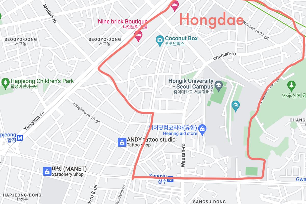 Hongdae được biết đến với các câu lạc bộ mà người trẻ Hàn Quốc và người nước ngoài thích đến vào cuối tuần. Khu vực này đông đúc với những người ở độ tuổi đầu 20 đang tìm kiếm một đêm vui vẻ! Bởi vì là một thị trấn đại học, nó không đắt đỏ như các khu vực câu lạc bộ nổi tiếng khác như Itaewon và Gangnam. Có rất nhiều quán cà phê, nhà hàng và thậm chí cả cửa hàng bán phụ kiện và quần áo dễ thương với giá cả phải chăng!