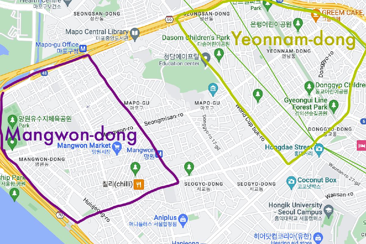 Không xa là Mangwon-dong, một nơi tương đối mới trong danh sách 'Khu phố thời thượng'. Khu vực này bắt đầu nổi lên vào năm 2015-2016 và hiện tại là một điểm phải đến vì tất cả các quán cà phê và nhà hàng thịnh hành. Công viên sông Hàn Mangwon nổi tiếng cho các buổi picnic khi thời tiết đẹp và chợ Mangwon có một trong những lựa chọn đồ ăn đường phố tốt nhất ở Seoul.