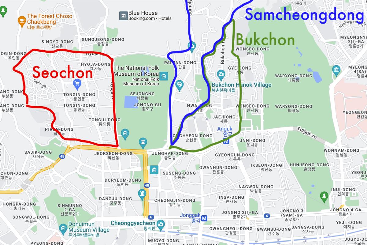 Seochon, Bukchon, và Samcheong-dong là các khu phố bao quanh Cung điện Gyeongbokgung nổi tiếng. Các tòa nhà chủ yếu là thấp và có một số lượng lớn Hanok, những ngôi nhà truyền thống của Hàn Quốc. Có một sự lựa chọn tuyệt vời của những quán cà phê và nhà hàng độc đáo, thẩm mỹ, lý tưởng cho việc đi cafe-hopping.