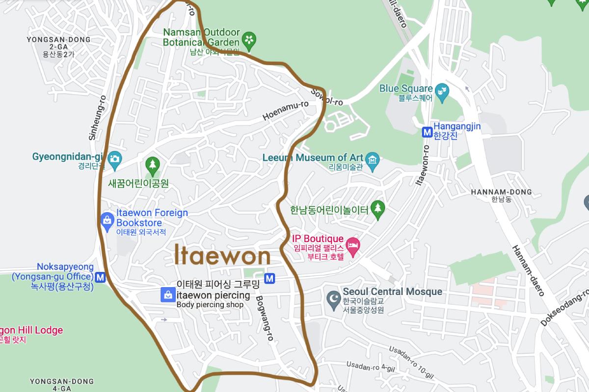 Itaewon nổi tiếng là nơi đông đúc người nước ngoài kể từ khi căn cứ quân sự của Mỹ từng ở gần đó. Đây là nơi bạn sẽ muốn đến để thưởng thức ẩm thực nước ngoài chính hiệu. Itaewon cũng nổi tiếng với các câu lạc bộ và quán bar. Họ có nhiều loại câu lạc bộ như câu lạc bộ hip-hop, câu lạc bộ jazz, câu lạc bộ EDM/House, và nhiều hơn thế nữa! Khu vực lân cận gọi là Hannam-dong được biết đến là nơi ở của những người nổi tiếng lớn nhất Hàn Quốc. Các quán cà phê và nhà hàng ở đây cũng hợp thời và thẩm mỹ.