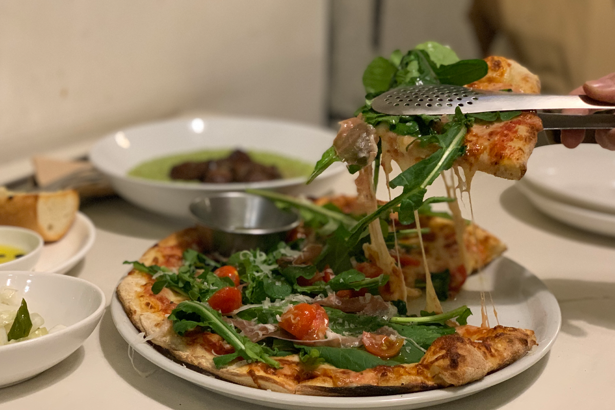 Pizza Rucola Prosciutto được phủ một lớp sốt cà chua, phô mai mozzarella, phô mai parmesan và cà chua bi, được tẩm thêm dầu ô liu thơm ngon vô cùng.