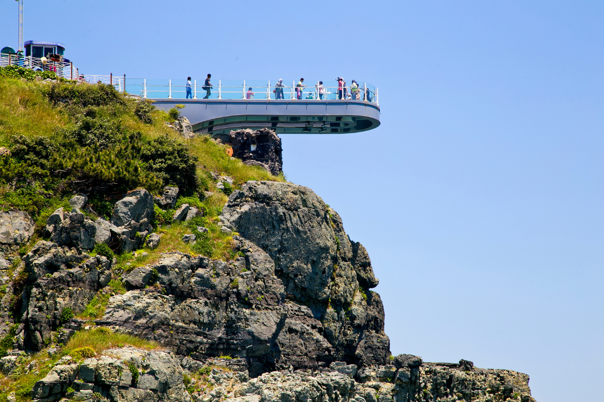Cây cầu Oryukdo Skywalk được xây dựng trên một vách đá ven biển cao tới 35 mét. Toàn bộ cây cầu được làm bằng kính, bạn có thể tận hưởng khung cảnh tuyệt vời của những con sóng và vách đá qua lớp kính trong suốt. Khi bầu trời trong xanh và không có mây, bạn cũng có thể nhìn thấy đảo Tsushima của Nhật Bản.