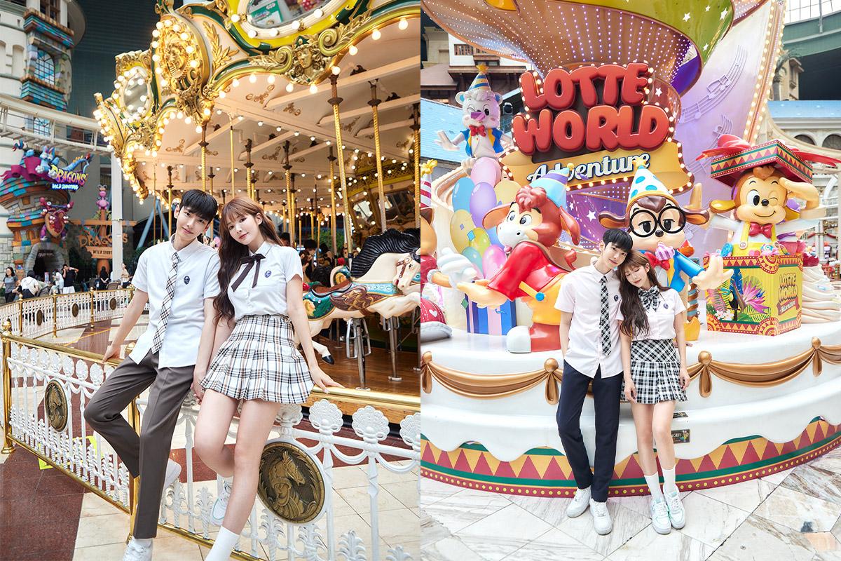 Mặc đồng phục học sinh chụp ảnh ở các điểm du lịch nổi tiếng như Lotte World đã trở thành một xu hướng vài năm nay ở Hàn Quốc.