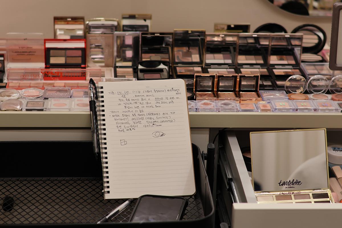 Từ phấn mắt đến kem che khuyết điểm, phấn má, kẻ mắt, mascara, son môi, và nhiều hơn nữa, bạn có thể thấy tất cả các loại mỹ phẩm. Chỉ cần nhìn thôi, thời gian trôi nhanh quá! Chúng tôi dự định nhận tư vấn trang điểm 1:2 với nhóm hôm nay. Vậy hãy xem nó hoạt động như thế nào nhé?