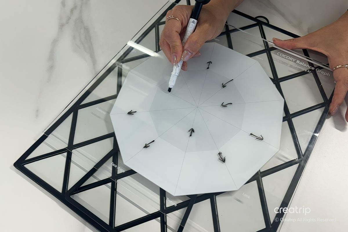 Sau khi hoàn thành việc đo lường, tôi ngồi trước gương để nhận được hướng dẫn chính xác cho kiểu của mình bằng cách sử dụng công cụ.Để có một đánh giá khách quan, tôi mặc một chiếc áo trắng và buộc tóc gọn gàng.