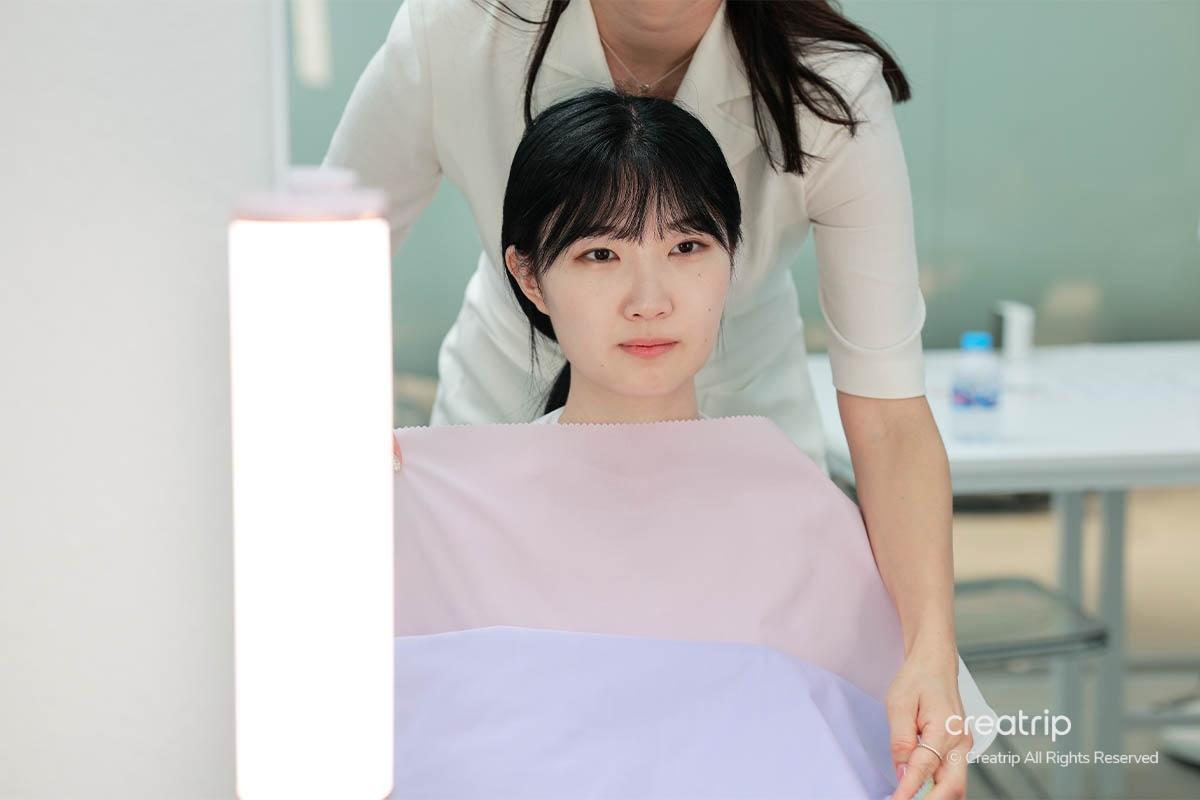 Bây giờ, tôi sẽ chính thức sử dụng tấm che để nhận tư vấn màu sắc cá nhân. Không cần phải để mặt mộc trong quá trình tư vấn, nhưng tốt hơn là nên bỏ son môi. Tôi cũng khuyên bạn nên mặc áo không có cổ.